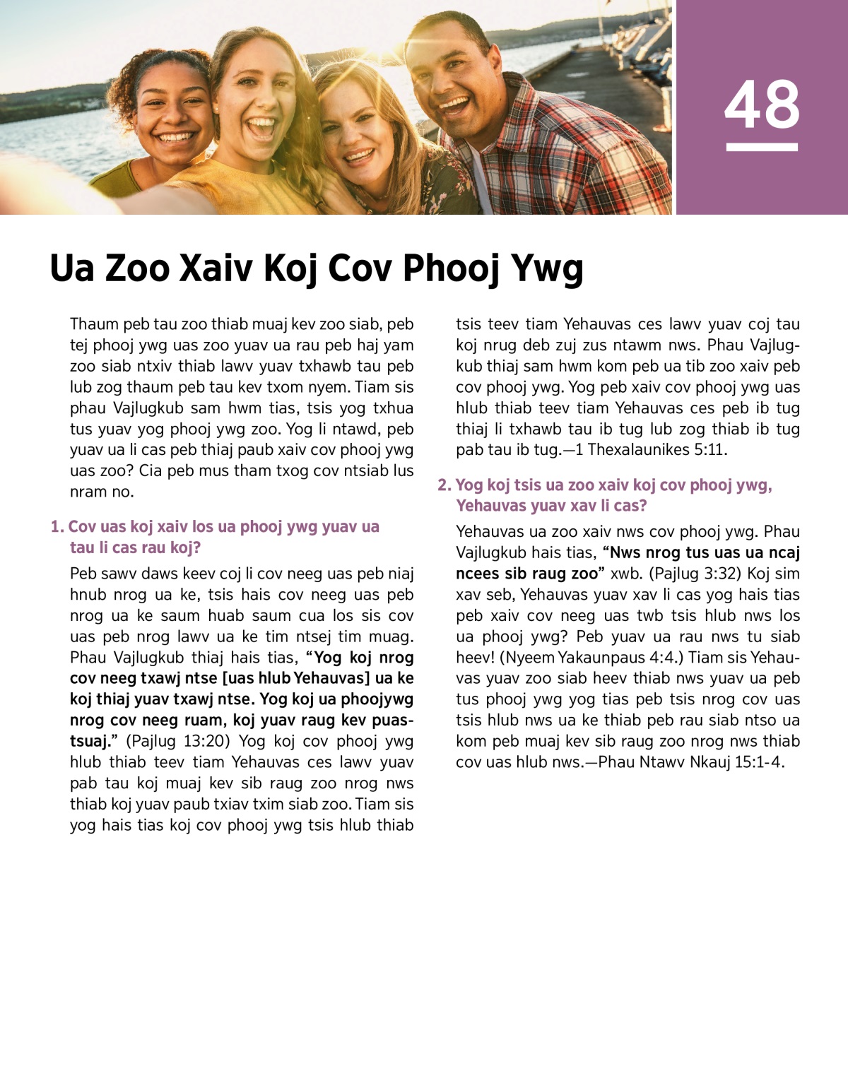 Thaum peb tau zoo thiab muaj kev zoo siab, peb tej phooj ywg uas zoo yuav ua rau peb haj yam zoo siab ntxiv thiab lawv yuav txhawb tau peb lub zog thaum peb tau kev txom nyem. Tiam sis phau Vajlugkub sam hwm tias, tsis yog txhua tus yuav yog phooj ywg zoo. Yog li ntawd, peb yuav ua li cas peb thiaj paub xaiv cov phooj ywg uas zoo? Cia peb mus tham txog cov ntsiab lus nram no.
