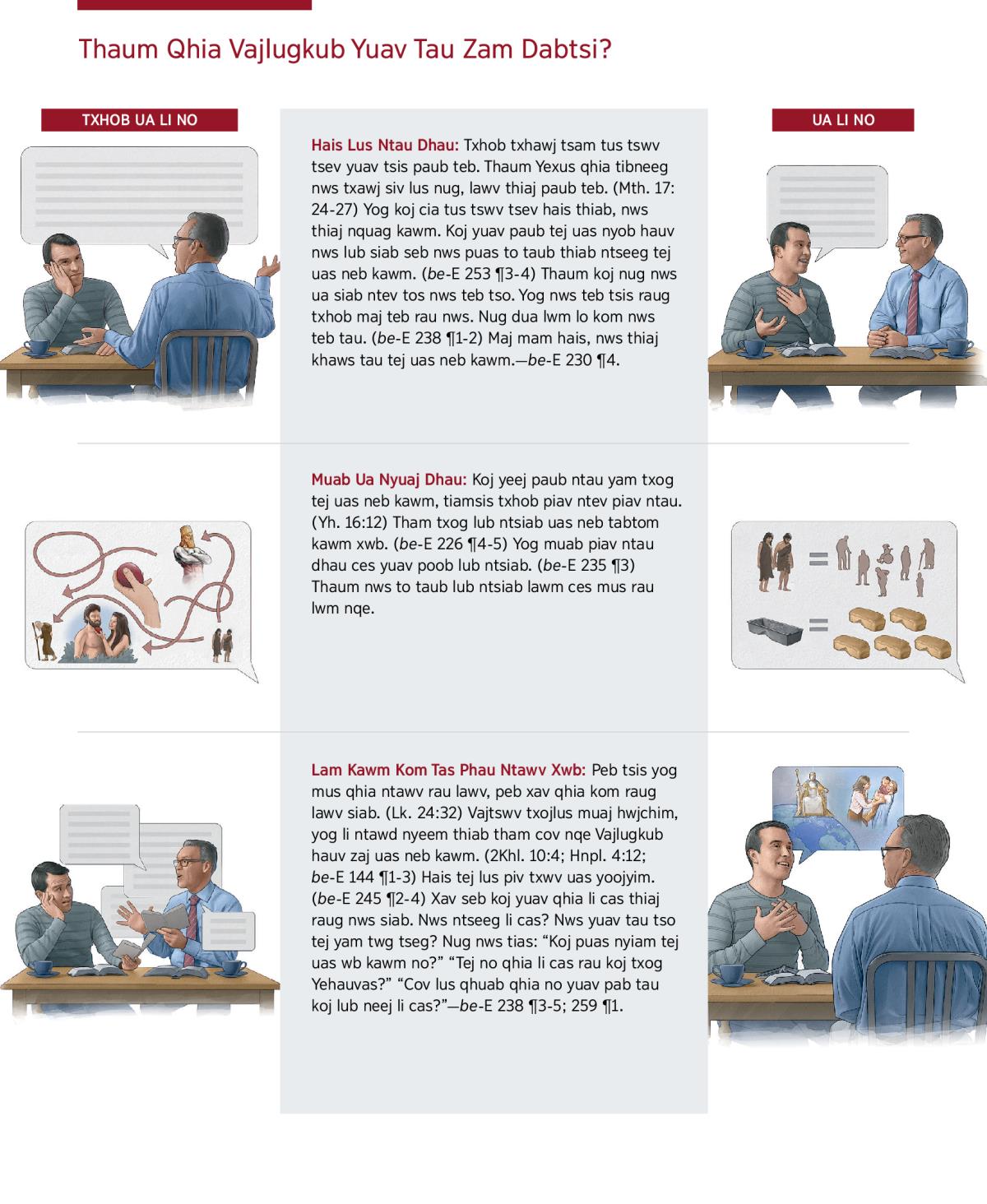 Lam Kawm Kom Tas Phau Ntawv Xwb: Peb tsis yog mus qhia ntawv rau lawv, peb xav qhia kom raug lawv siab. (Lk. 24:32) Vajtswv txojlus muaj hwjchim, yog li ntawd nyeem thiab tham cov nqe Vajlugkub hauv zaj uas neb kawm. (2Khl. 10:4; Hnpl. 4:12; be-E 144 ¶1-3) Hais tej lus piv txwv uas yoojyim. (be-E 245 ¶2-4) Xav seb koj yuav qhia li cas thiaj raug nws siab. Nws ntseeg li cas? Nws yuav tau tso tej yam twg tseg? Nug nws tias: “Koj puas nyiam tej uas wb kawm no?” “Tej no qhia li cas rau koj txog Yehauvas?” “Cov lus qhuab qhia no yuav pab tau koj lub neej li cas?”—be-E 238 ¶3-5; 259 ¶1.