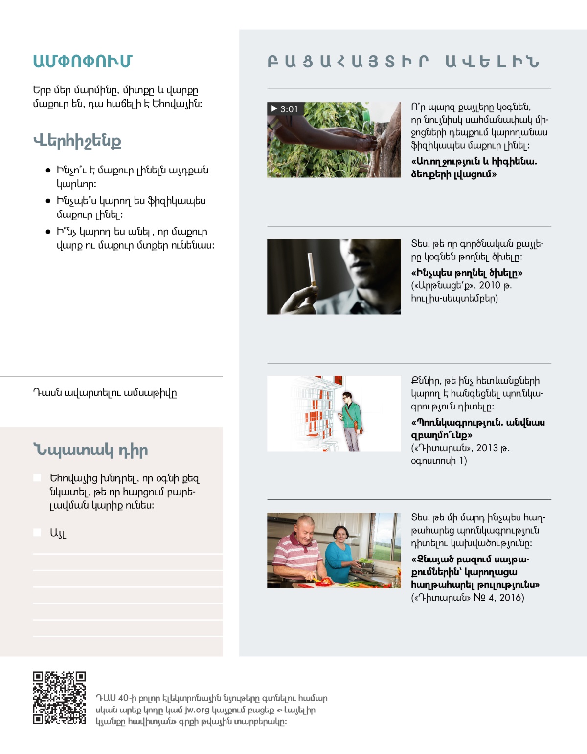 Տես, թե ֆիզիկական մաքրությունն ինչպես է փառք բերում Եհովային, և իմացիր, թե ինչպես կարելի է հաղթահարել անմաքուր սովորությունները։