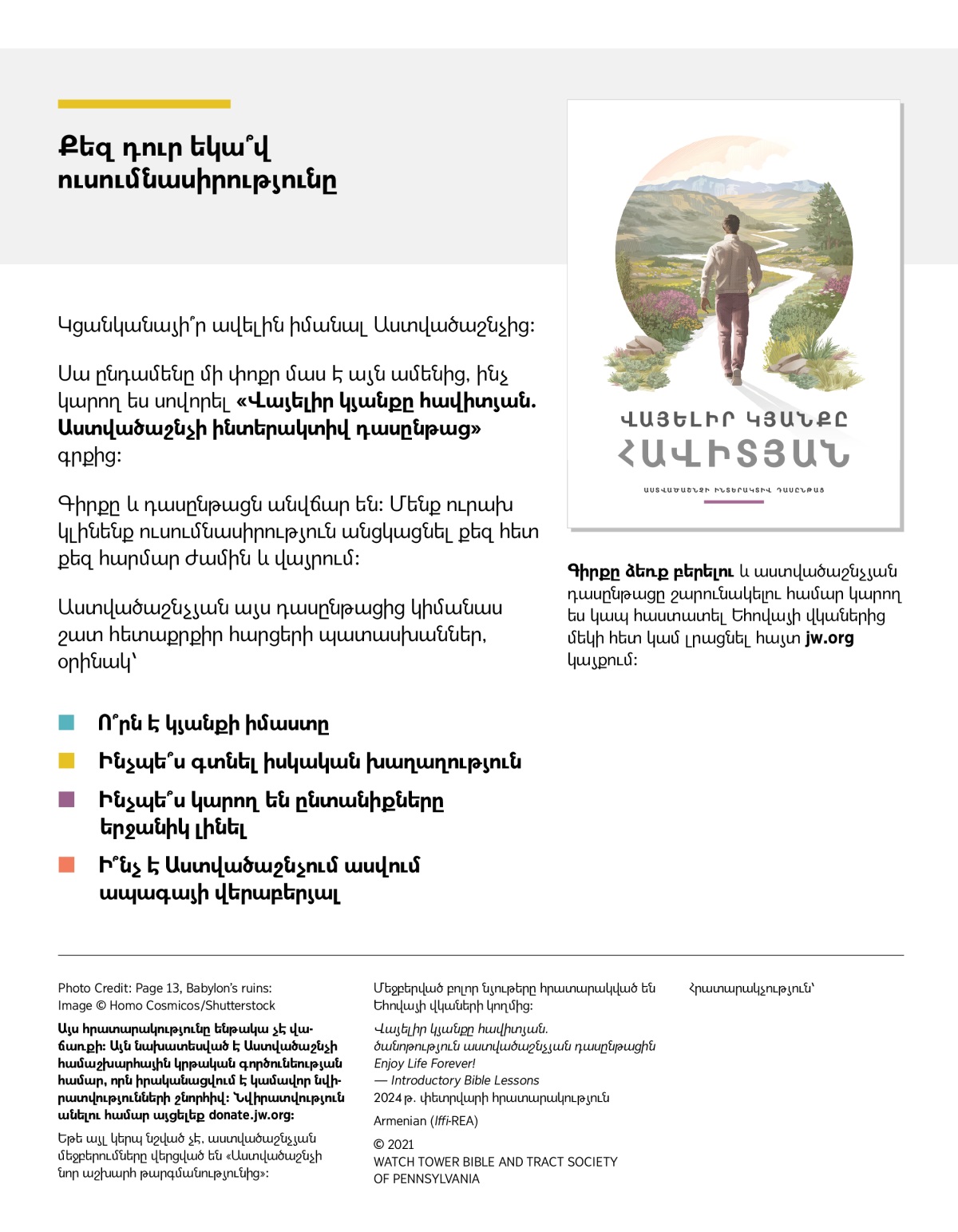 Գիրքը ձեռք բերելու և աստվածաշնչյան դասընթացը շարունակելու համար կարող ես կապ հաստատել Եհովայի վկաներից մեկի հետ կամ լրացնել հայտ jw.org կայքում։