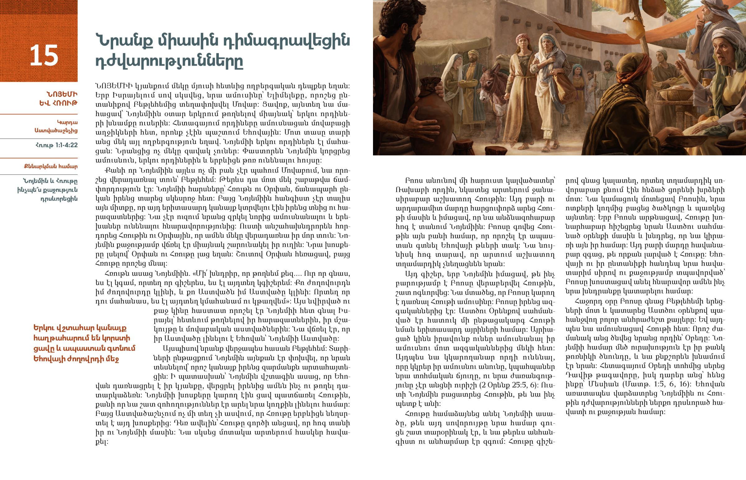 Երբ Նոյեմին դառնացած ու վշտացած էր, Հռութը օգնեց նրան։ Ուրիշներից խոնարհաբար օգնություն ընդունելու վերաբերյալ ի՞նչ ենք սովորում Նոյեմիից։ Ուրիշներին քաջալերելու վերաբերյալ ի՞նչ ենք սովորում Հռութից։