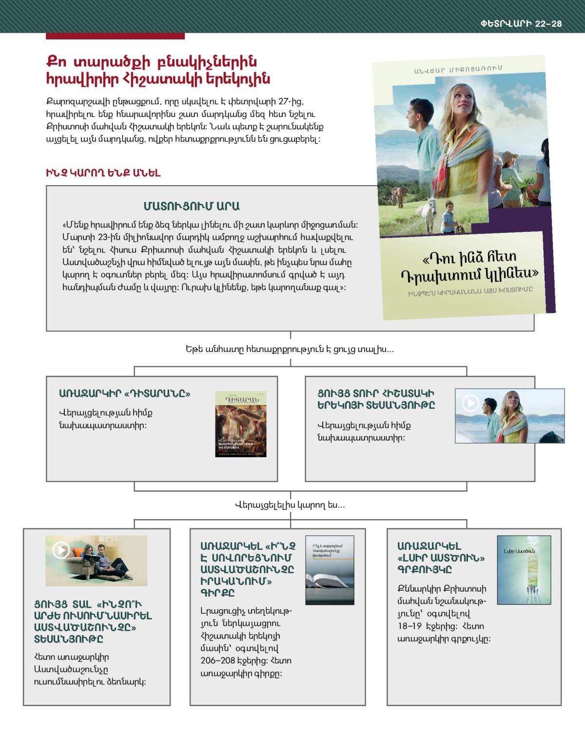 Քարոզարշավի ընթացքում, որը սկսվելու է փետրվարի 27-ից, հրավիրելու ենք հնարավորինս շատ մարդկանց մեզ հետ նշելու Քրիստոսի մահվան Հիշատակի երեկոն։ Նաև պետք է շարունակենք այցելել այն մարդկանց, ովքեր հետաքրքրությունն են ցուցաբերել։