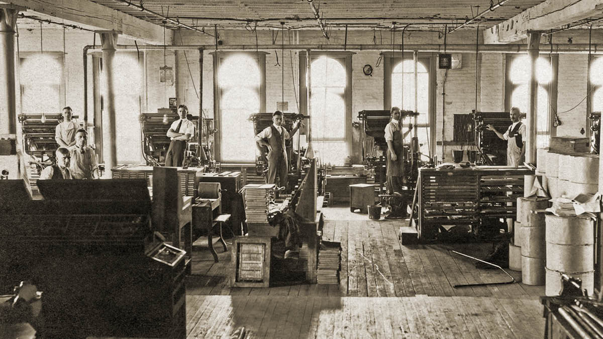Տպարանում եղբայրները կանգնած են իրենց լինոտիպ մեքենաների կողքին