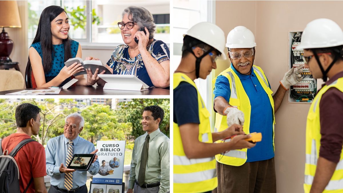 e ՆԿԱՐ։ Երիտասարդ քույրը տարեց քրոջից սովորում է հեռախոսով վկայություն տալ։ Տարեց եղբայրը ցուցատախտակով քաջաբար վկայություն տալու օրինակ է ծառայում։ Փորձառու եղբայրը սովորեցնում է մյուսներին, թե ինչպես կատարել Թագավորության սրահի տեխսպասարկումը։
