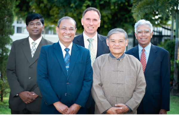 Վերևում։ Առաջին միսիոներները՝ Հյուբերտ Սմեդստադը, Ռոբերտ Քիրքը, Նորման Բարբերը և Ռոբերտ Ռիչարդսը։ Ներքևում։ (Հետևի շարք) Նենսի դը Սոուզա, Միլթոն Հենշել, Նաթան Նոր, Ռոբերտ Քիրք, Թերենս դը Սոուզա, (առջևի շարք) Ռասել Մոբլի, Պենելոպե Ջարվիս-Վագ, Ֆիլիս Ծատոս, Դեյզի դը Սոուզա, Բասիլ Ծատոս