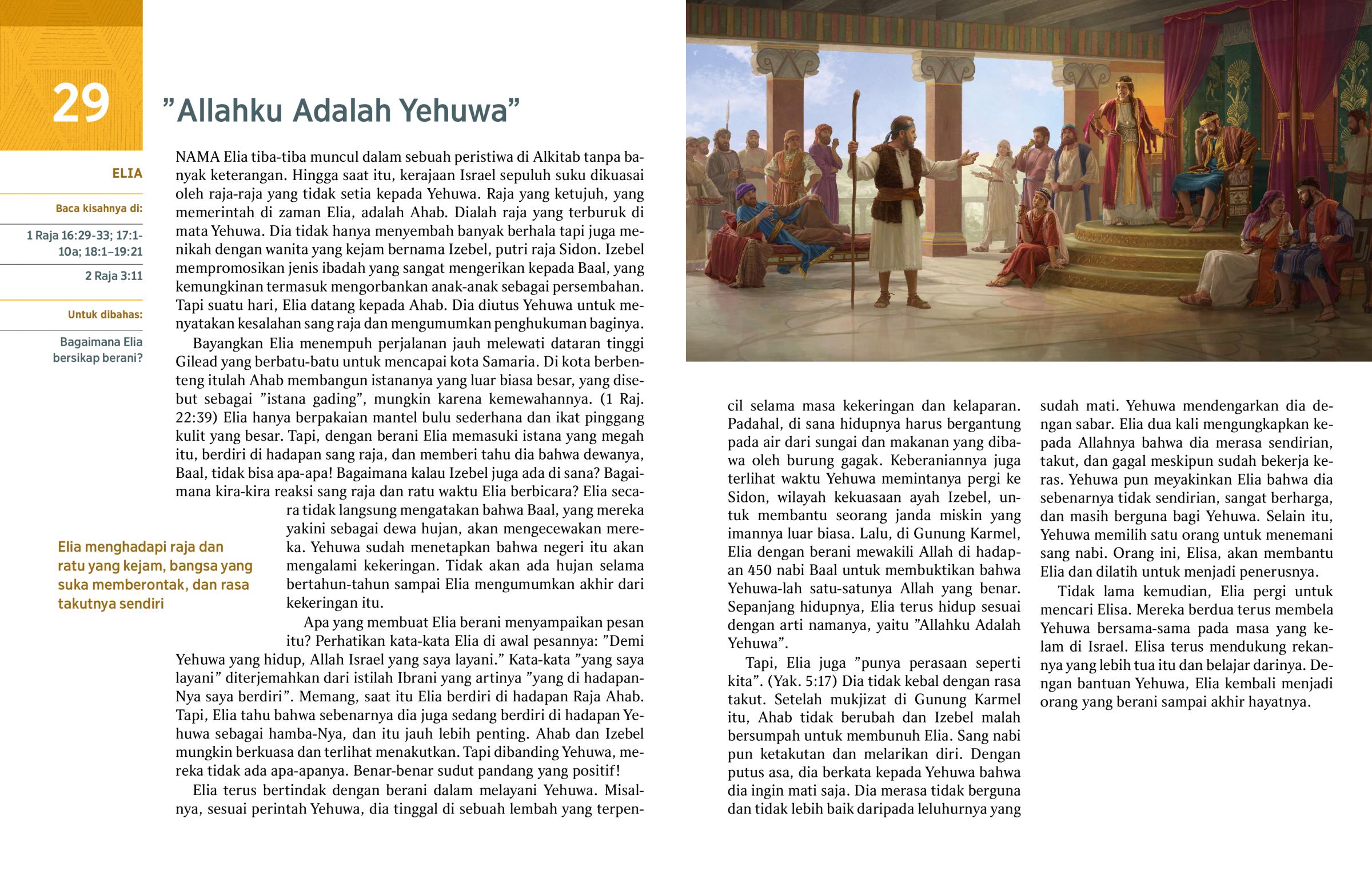 NAMA Elia tiba-tiba muncul dalam sebuah peristiwa di Alkitab tanpa banyak keterangan. Hingga saat itu, kerajaan Israel sepuluh suku dikuasai oleh raja-raja yang tidak setia kepada Yehuwa. Raja yang ketujuh, yang memerintah di zaman Elia, adalah Ahab. Dialah raja yang terburuk di mata Yehuwa. Dia tidak hanya menyembah banyak berhala tapi juga menikah dengan wanita yang kejam bernama Izebel, putri raja Sidon. Izebel mempromosikan jenis ibadah yang sangat mengerikan kepada Baal, yang kemungkinan termasuk mengorbankan anak-anak sebagai persembahan. Tapi suatu hari, Elia datang kepada Ahab. Dia diutus Yehuwa untuk menyatakan kesalahan sang raja dan mengumumkan penghukuman baginya.