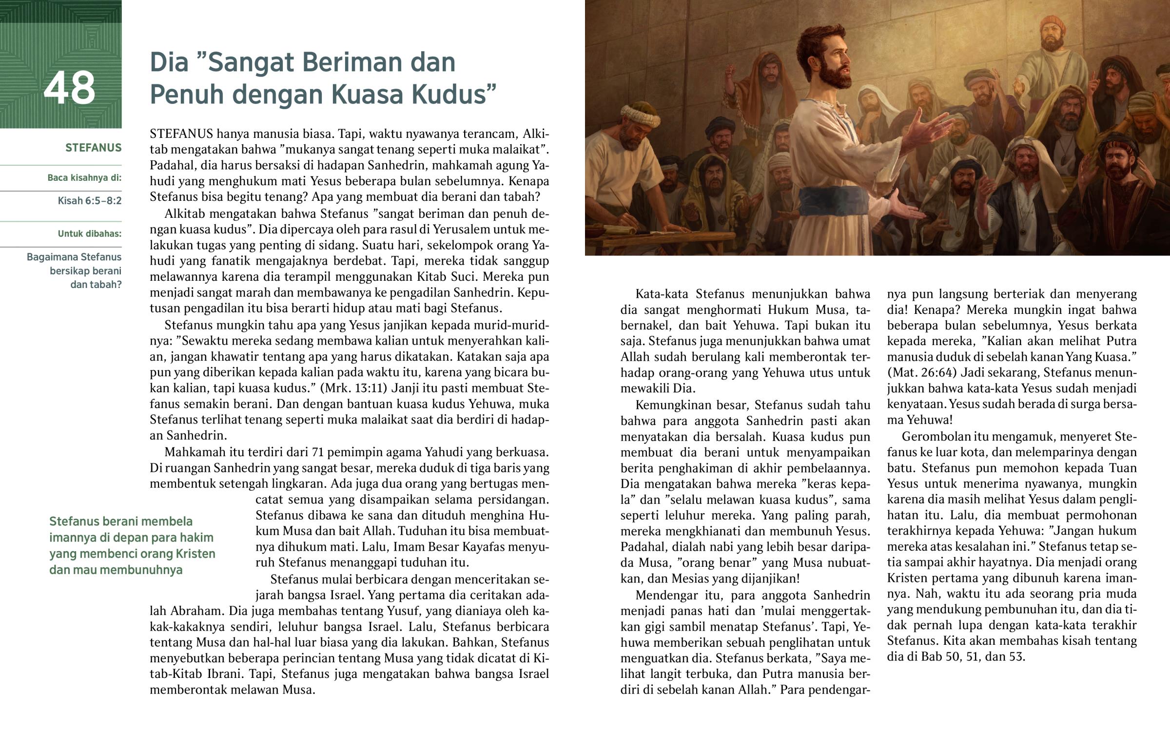 Stefanus mungkin tahu apa yang Yesus janjikan kepada murid-muridnya: ”Sewaktu mereka sedang membawa kalian untuk menyerahkan kalian, jangan khawatir tentang apa yang harus dikatakan. Katakan saja apa pun yang diberikan kepada kalian pada waktu itu, karena yang bicara bukan kalian, tapi kuasa kudus.” (Mrk. 13:11) Janji itu pasti membuat Stefanus semakin berani. Dan dengan bantuan kuasa kudus Yehuwa, muka Stefanus terlihat tenang seperti muka malaikat saat dia berdiri di hadapan Sanhedrin.