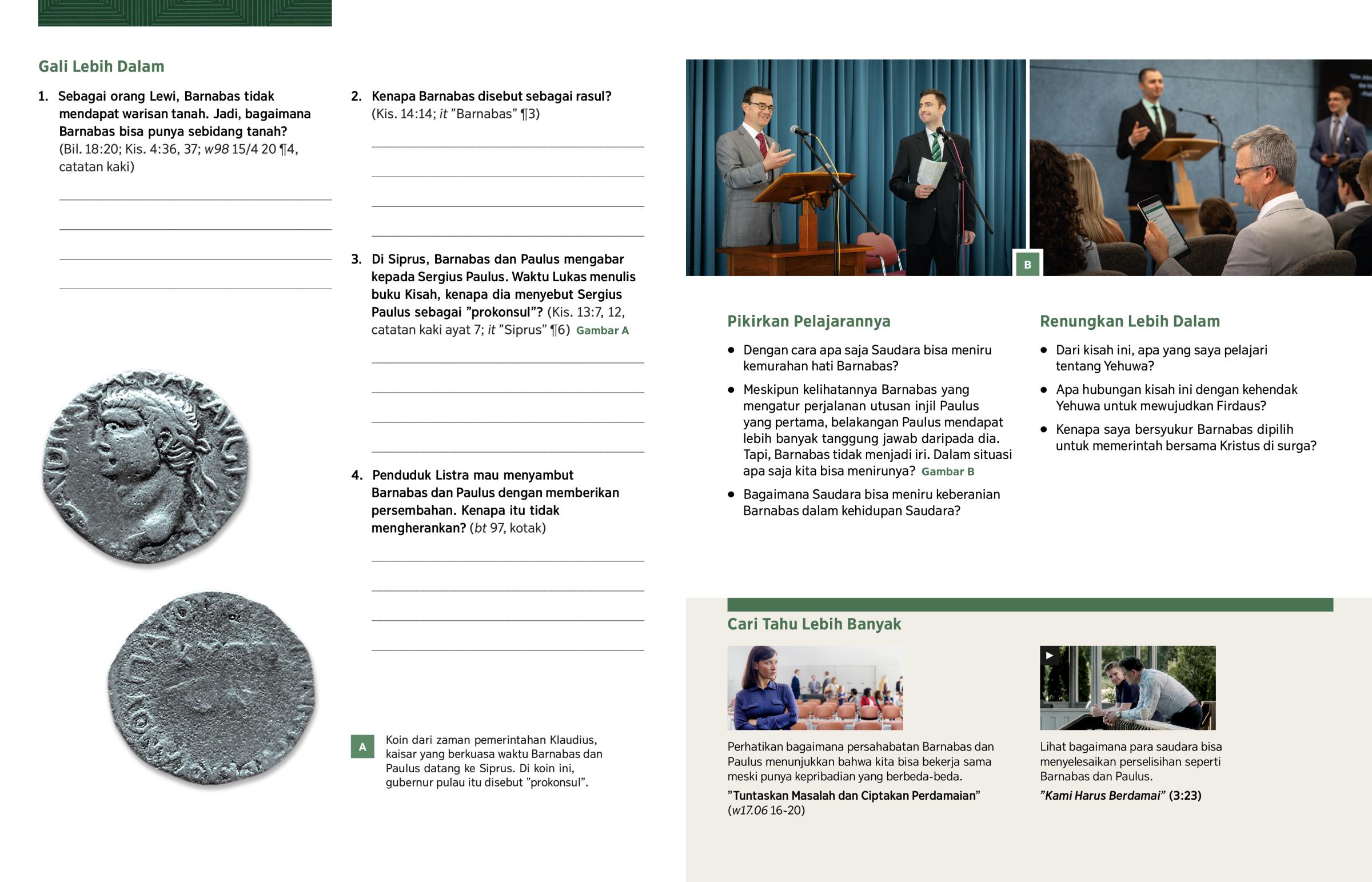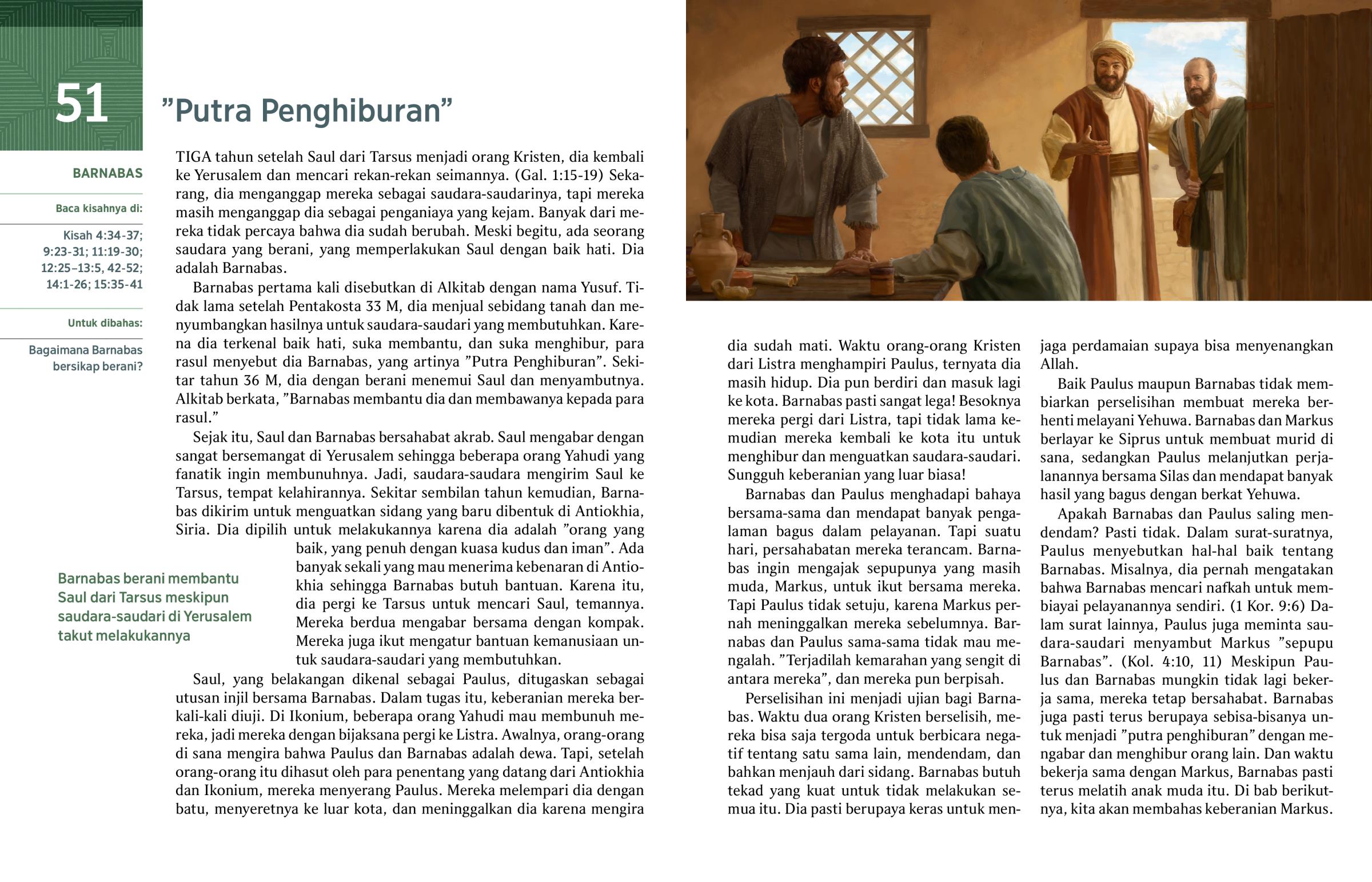 Meskipun kelihatannya Barnabas yang mengatur perjalanan utusan injil Paulus yang pertama, belakangan Paulus mendapat lebih banyak tanggung jawab daripada dia. Tapi, Barnabas tidak menjadi iri. Dalam situasi apa saja kita bisa menirunya? Gambar B