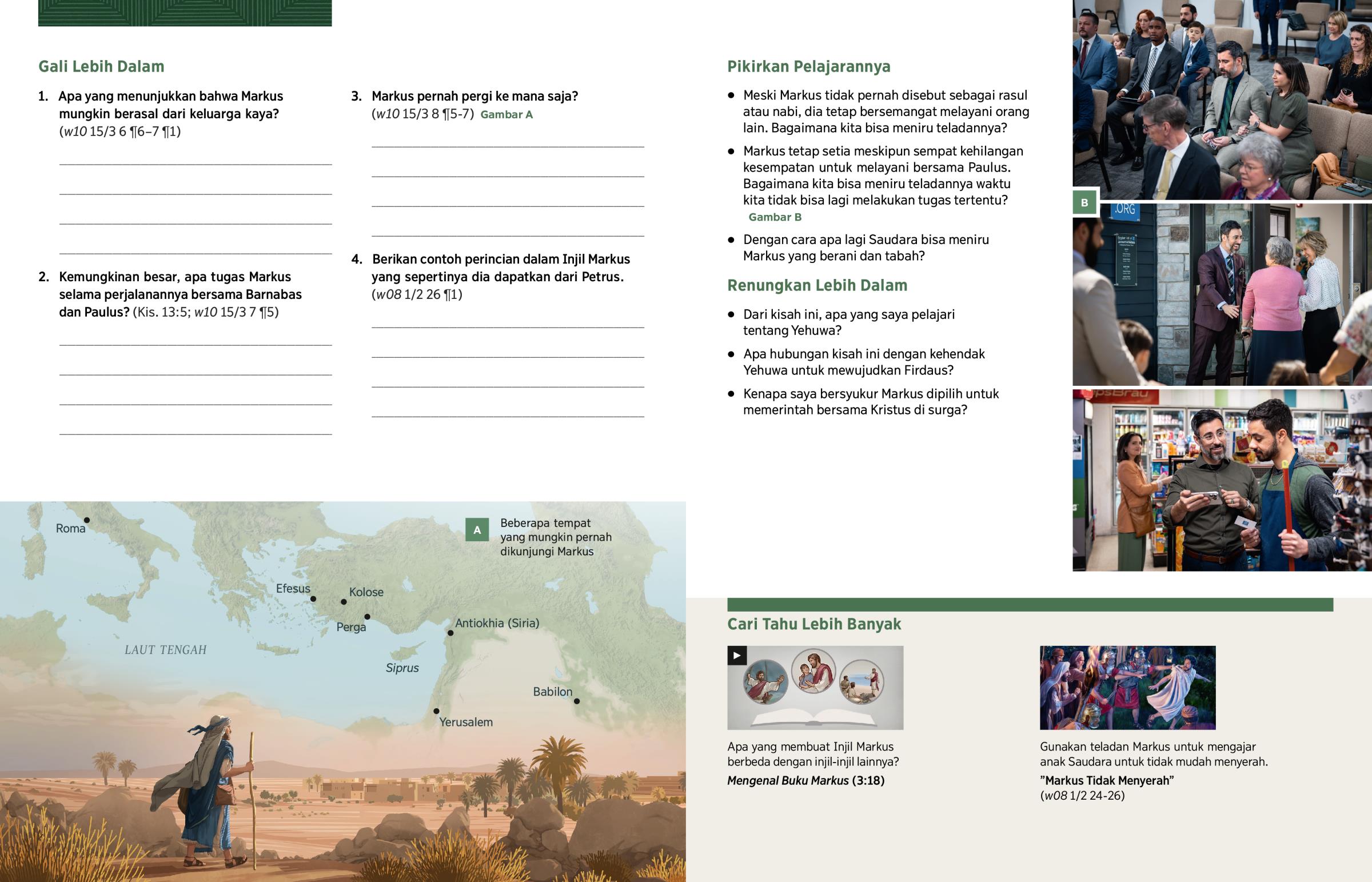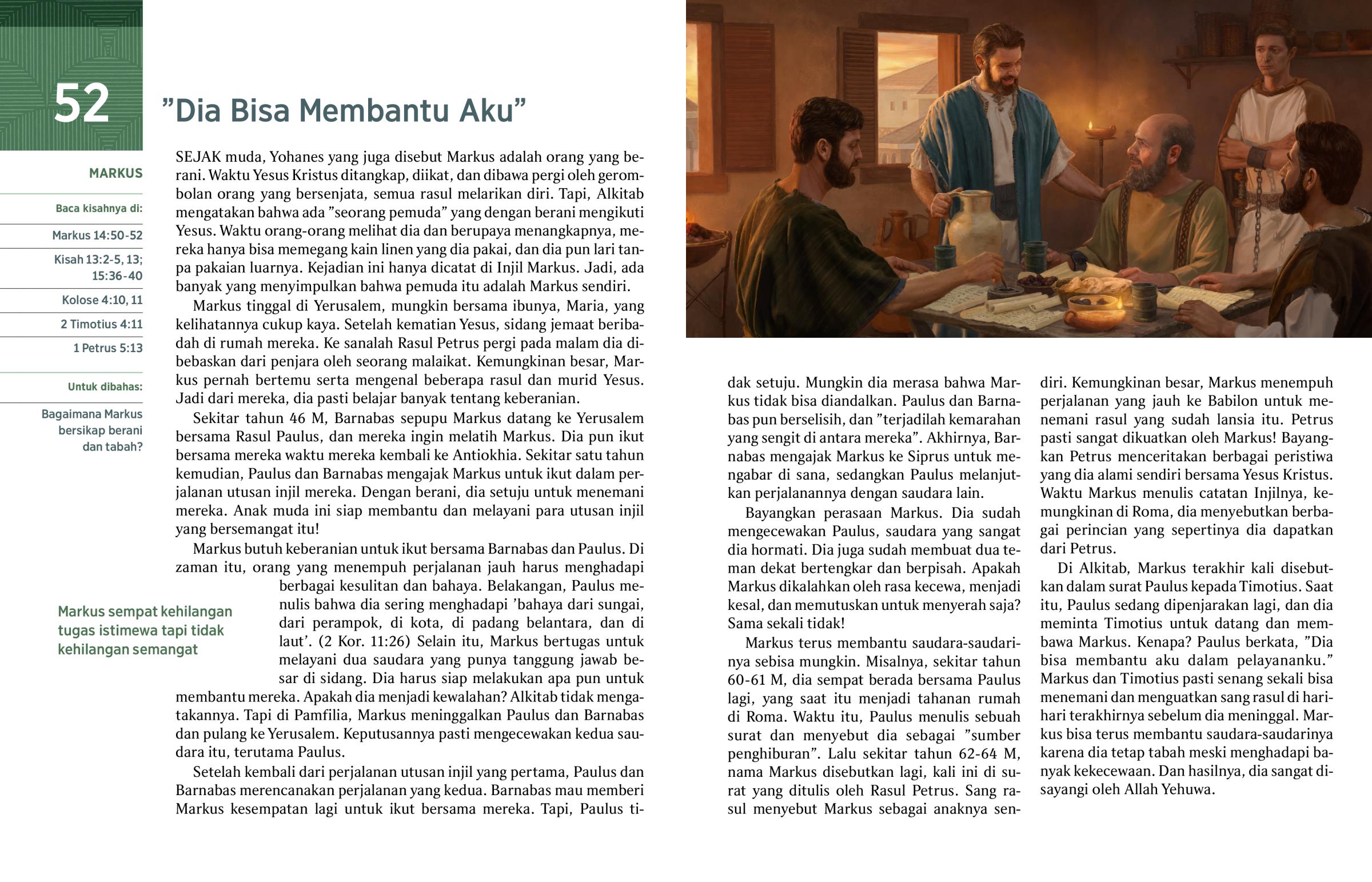 Markus tetap setia meskipun sempat kehilangan kesempatan untuk melayani bersama Paulus. Bagaimana kita bisa meniru teladannya waktu kita tidak bisa lagi melakukan tugas tertentu? Gambar B