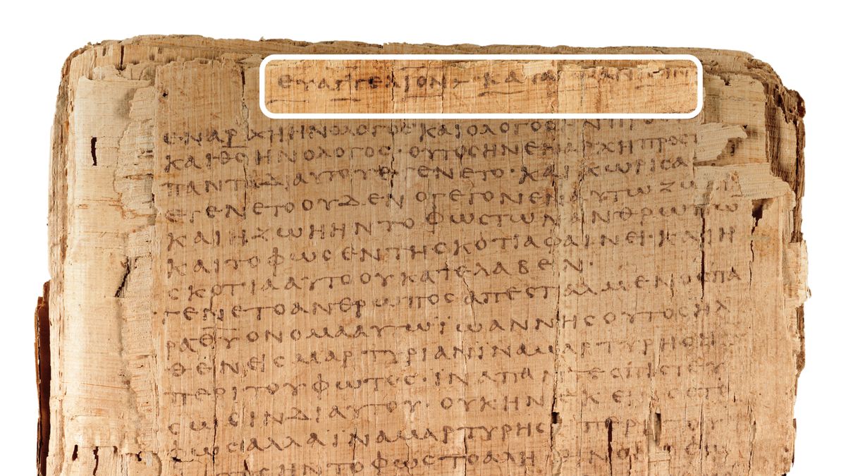 Gambar A: Manuskrip yang berasal dari sekitar 200 M, yang berjudul ”Kabar Baik Menurut Yohanes” (ditandai pada gambar)