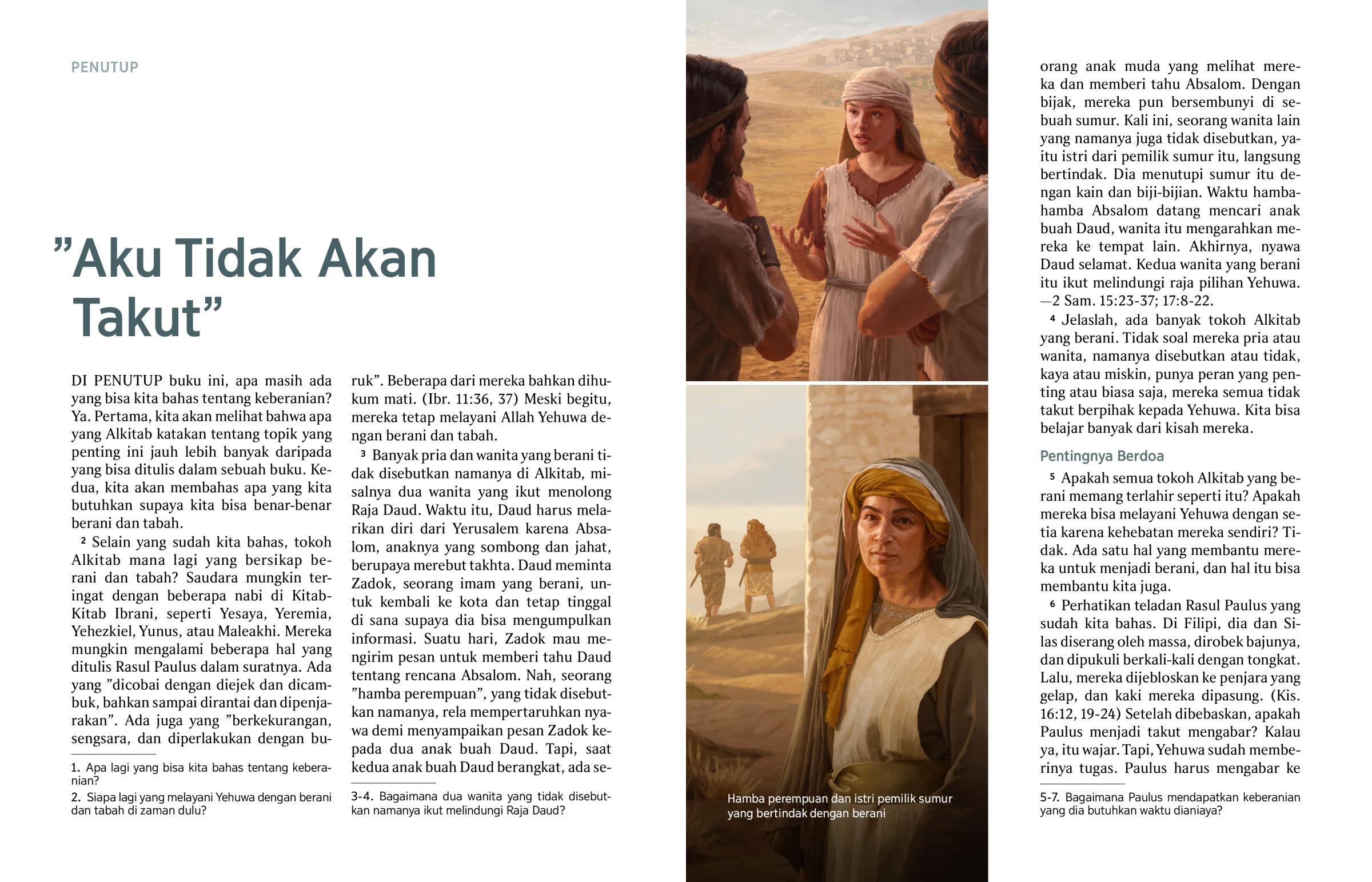 3 Banyak pria dan wanita yang berani tidak disebutkan namanya di Alkitab, misalnya dua wanita yang ikut menolong Raja Daud. Waktu itu, Daud harus melarikan diri dari Yerusalem karena Absalom, anaknya yang sombong dan jahat, berupaya merebut takhta. Daud meminta Zadok, seorang imam yang berani, untuk kembali ke kota dan tetap tinggal di sana supaya dia bisa mengumpulkan informasi. Suatu hari, Zadok mau mengirim pesan untuk memberi tahu Daud tentang rencana Absalom. Nah, seorang ”hamba perempuan”, yang tidak disebutkan namanya, rela mempertaruhkan nyawa demi menyampaikan pesan Zadok kepada dua anak buah Daud. Tapi, saat kedua anak buah Daud berangkat, ada seorang anak muda yang melihat mereka dan memberi tahu Absalom. Dengan bijak, mereka pun bersembunyi di sebuah sumur. Kali ini, seorang wanita lain yang namanya juga tidak disebutkan, yaitu istri dari pemilik sumur itu, langsung bertindak. Dia menutupi sumur itu dengan kain dan biji-bijian. Waktu hamba-hamba Absalom datang mencari anak buah Daud, wanita itu mengarahkan mereka ke tempat lain. Akhirnya, nyawa Daud selamat. Kedua wanita yang berani itu ikut melindungi raja pilihan Yehuwa.—2 Sam. 15:23-37; 17:8-22.