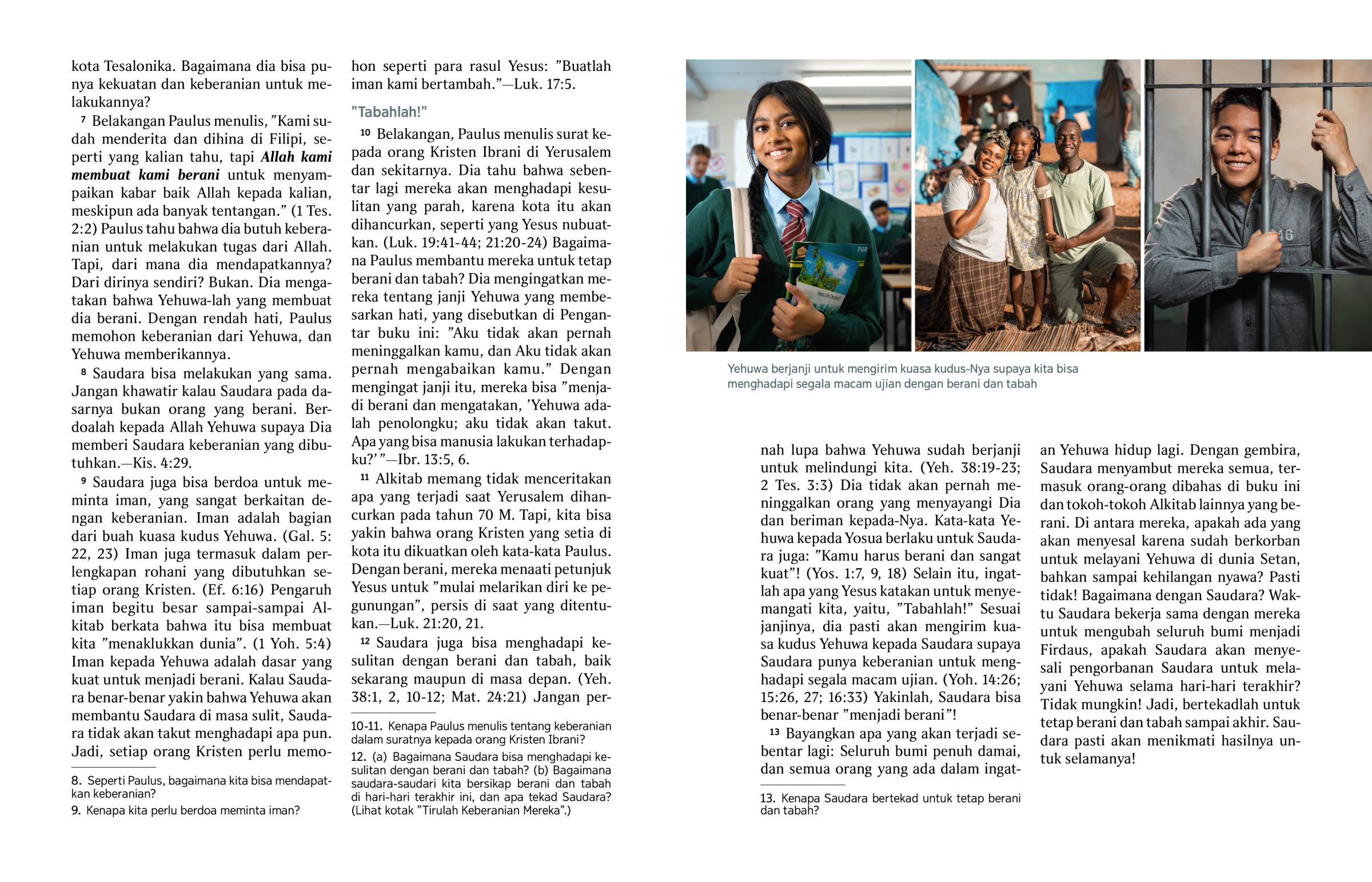 10 Belakangan, Paulus menulis surat kepada orang Kristen Ibrani di Yerusalem dan sekitarnya. Dia tahu bahwa sebentar lagi mereka akan menghadapi kesulitan yang parah, karena kota itu akan dihancurkan, seperti yang Yesus nubuatkan. (Luk. 19:41-44; 21:20-24) Bagaimana Paulus membantu mereka untuk tetap berani dan tabah? Dia mengingatkan mereka tentang janji Yehuwa yang membesarkan hati, yang disebutkan di Pengantar buku ini: ”Aku tidak akan pernah meninggalkan kamu, dan Aku tidak akan pernah mengabaikan kamu.” Dengan mengingat janji itu, mereka bisa ”menjadi berani dan mengatakan, ’Yehuwa adalah penolongku; aku tidak akan takut. Apa yang bisa manusia lakukan terhadapku?’”—Ibr. 13:5, 6.