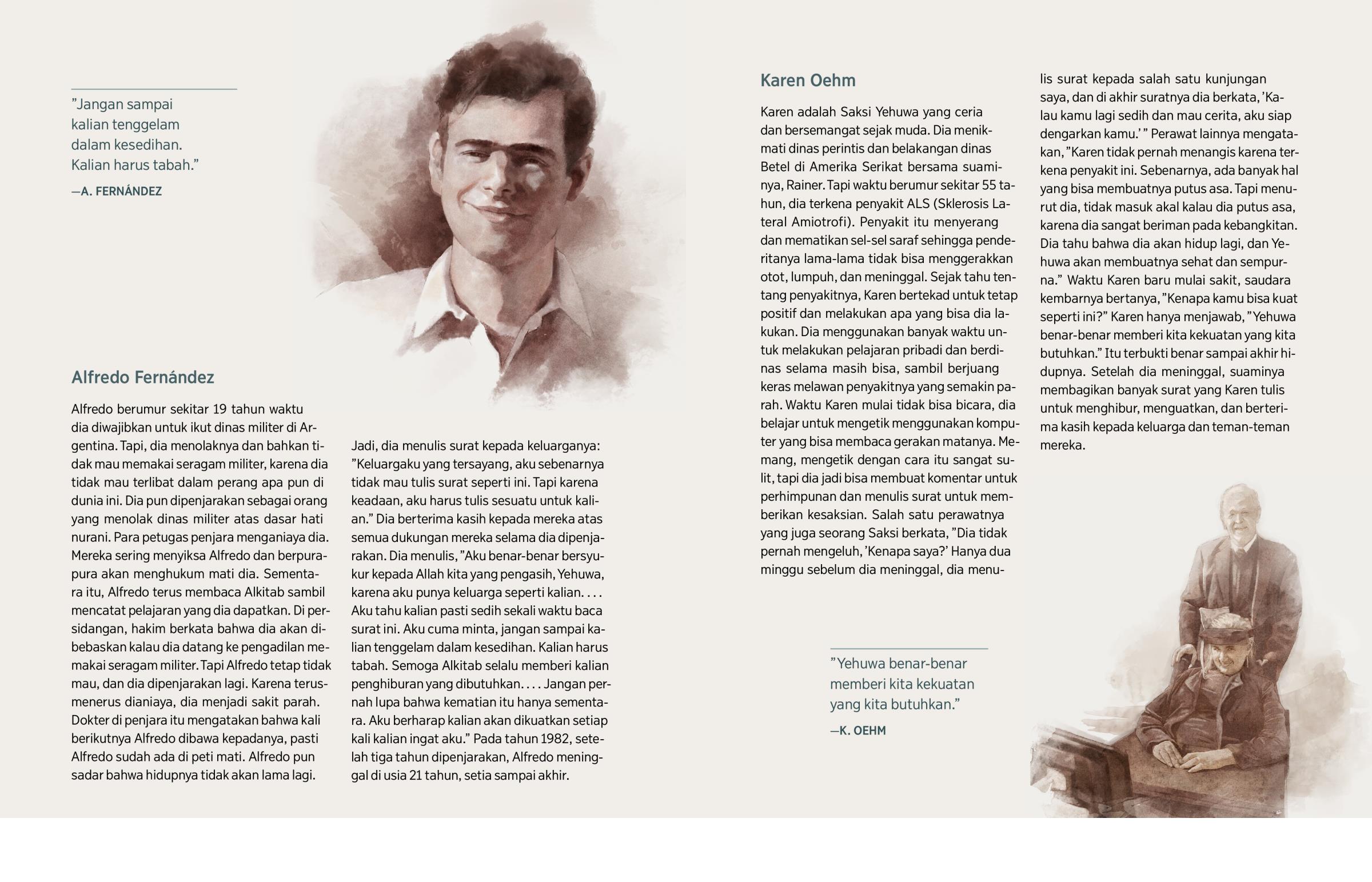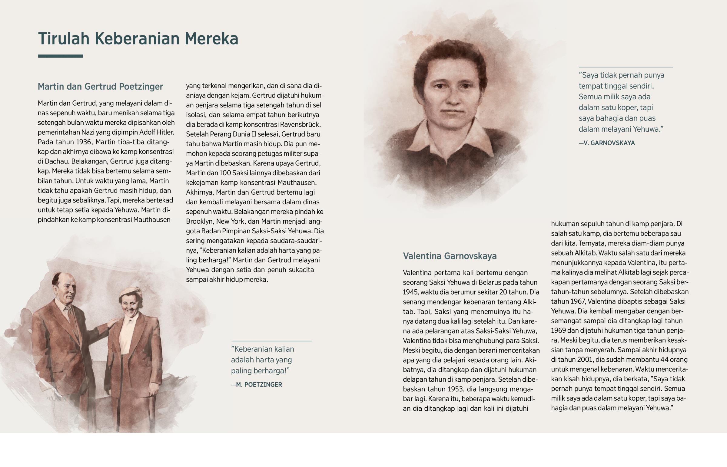 13 Bayangkan apa yang akan terjadi sebentar lagi: Seluruh bumi penuh damai, dan semua orang yang ada dalam ingatan Yehuwa hidup lagi. Dengan gembira, Saudara menyambut mereka semua, termasuk orang-orang dibahas di buku ini dan tokoh-tokoh Alkitab lainnya yang berani. Di antara mereka, apakah ada yang akan menyesal karena sudah berkorban untuk melayani Yehuwa di dunia Setan, bahkan sampai kehilangan nyawa? Pasti tidak! Bagaimana dengan Saudara? Waktu Saudara bekerja sama dengan mereka untuk mengubah seluruh bumi menjadi Firdaus, apakah Saudara akan menyesali pengorbanan Saudara untuk melayani Yehuwa selama hari-hari terakhir? Tidak mungkin! Jadi, bertekadlah untuk tetap berani dan tabah sampai akhir. Saudara pasti akan menikmati hasilnya untuk selamanya!