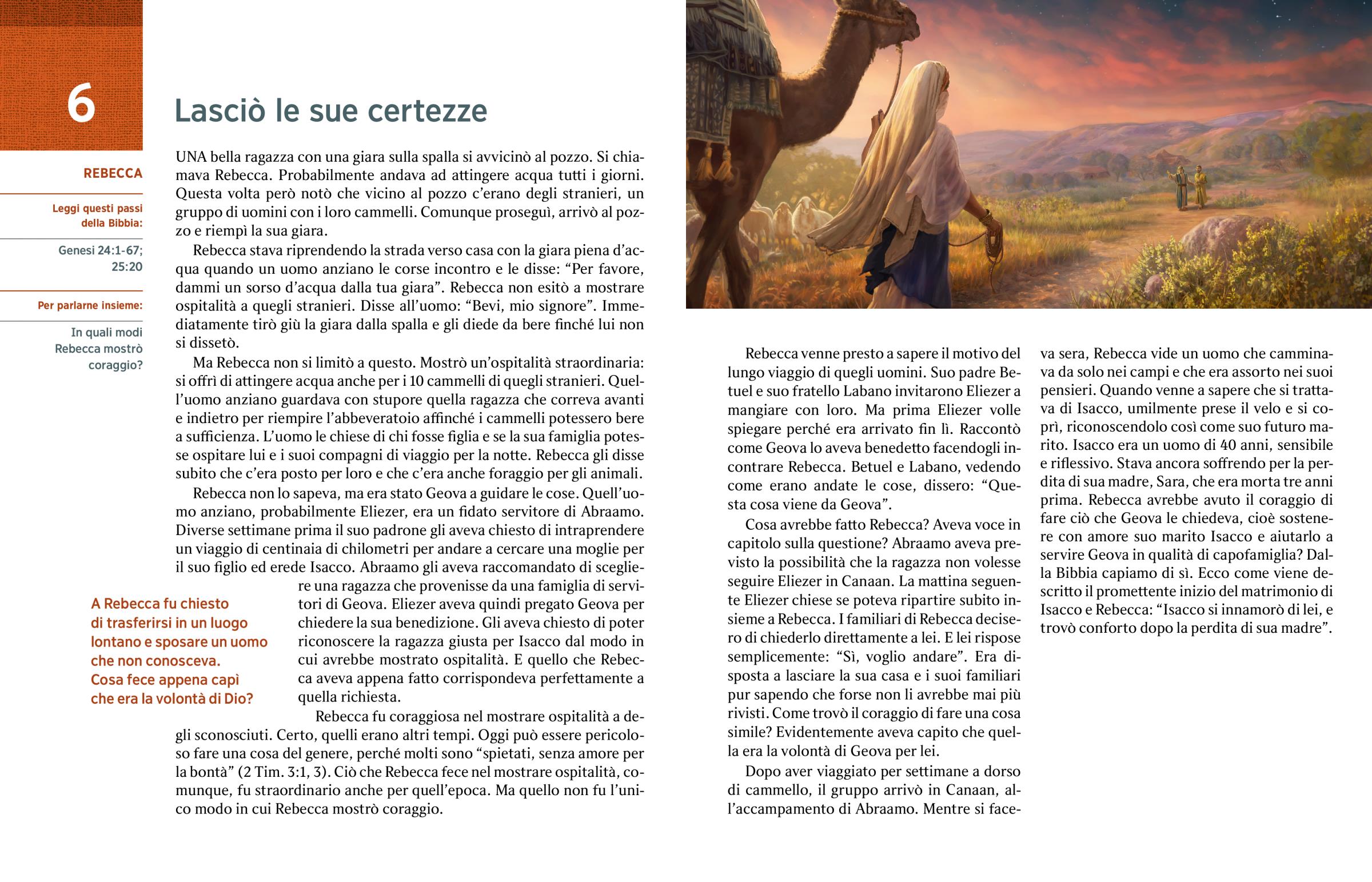 UNA bella ragazza con una giara sulla spalla si avvicinò al pozzo. Si chiamava Rebecca. Probabilmente andava ad attingere acqua tutti i giorni. Questa volta però notò che vicino al pozzo c’erano degli stranieri, un gruppo di uomini con i loro cammelli. Comunque proseguì, arrivò al pozzo e riempì la sua giara.