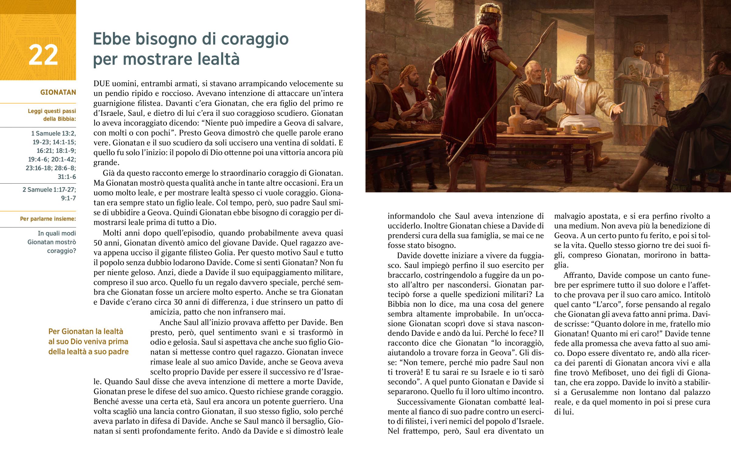 Già da questo racconto emerge lo straordinario coraggio di Gionatan. Ma Gionatan mostrò questa qualità anche in tante altre occasioni. Era un uomo molto leale, e per mostrare lealtà spesso ci vuole coraggio. Gionatan era sempre stato un figlio leale. Col tempo, però, suo padre Saul smise di ubbidire a Geova. Quindi Gionatan ebbe bisogno di coraggio per dimostrarsi leale prima di tutto a Dio.