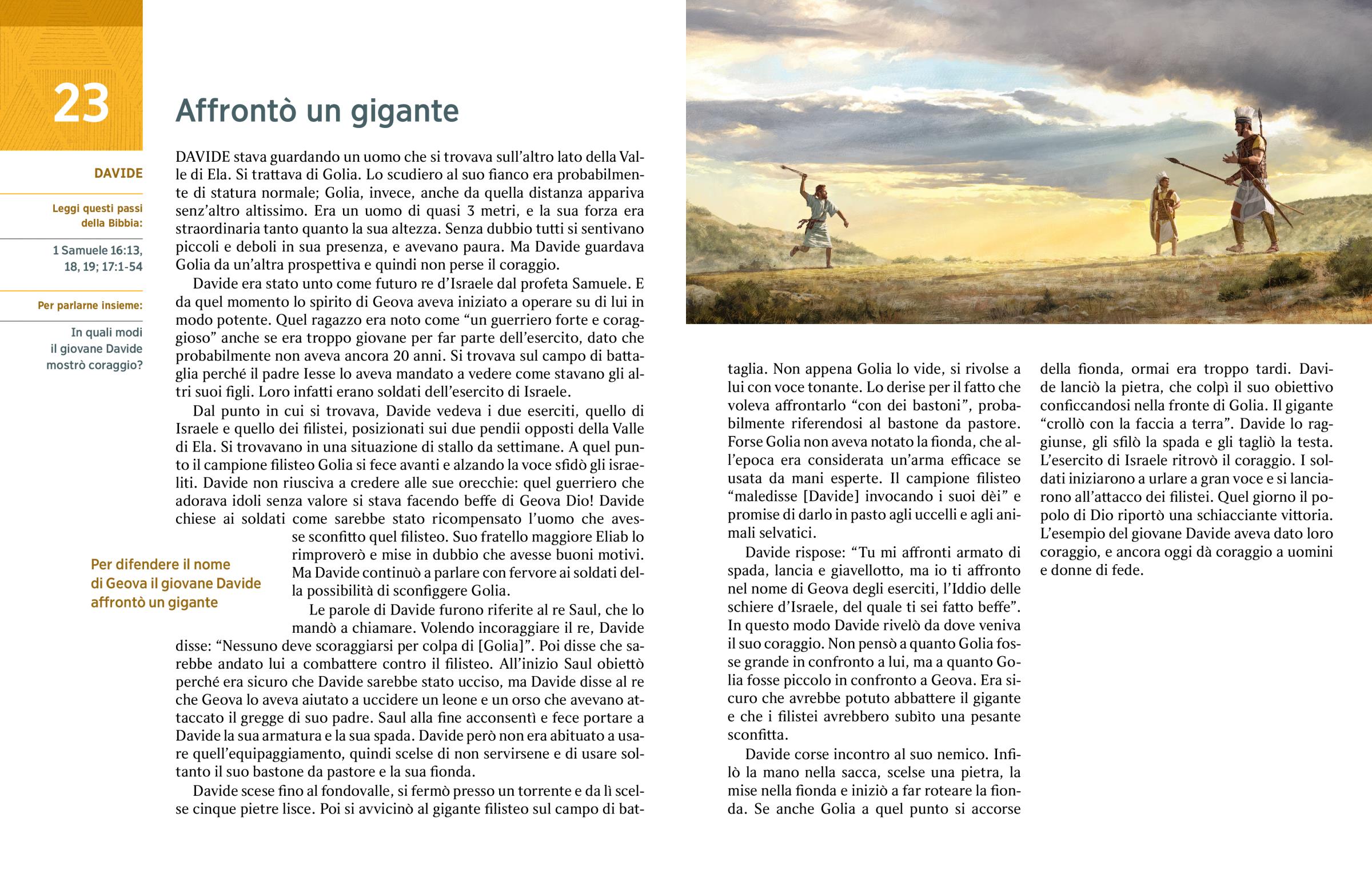 DAVIDE stava guardando un uomo che si trovava sull’altro lato della Valle di Ela. Si trattava di Golia. Lo scudiero al suo fianco era probabilmente di statura normale; Golia, invece, anche da quella distanza appariva senz’altro altissimo. Era un uomo di quasi 3 metri, e la sua forza era straordinaria tanto quanto la sua altezza. Senza dubbio tutti si sentivano piccoli e deboli in sua presenza, e avevano paura. Ma Davide guardava Golia da un’altra prospettiva e quindi non perse il coraggio.