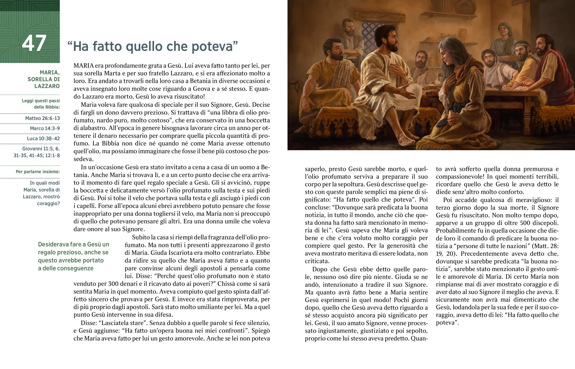 Disse: “Lasciatela stare”. Senza dubbio a quelle parole si fece silenzio, e Gesù aggiunse: “Ha fatto un’opera buona nei miei confronti”. Spiegò che Maria aveva fatto per lui un gesto amorevole. Anche se lei non poteva saperlo, presto Gesù sarebbe morto, e quell’olio profumato serviva a preparare il suo corpo per la sepoltura. Gesù descrisse quel gesto con queste parole semplici ma piene di significato: “Ha fatto quello che poteva”. Poi concluse: “Dovunque sarà predicata la buona notizia, in tutto il mondo, anche ciò che questa donna ha fatto sarà menzionato in memoria di lei”. Gesù sapeva che Maria gli voleva bene e che c’era voluto molto coraggio per compiere quel gesto. Per la generosità che aveva mostrato meritava di essere lodata, non criticata.