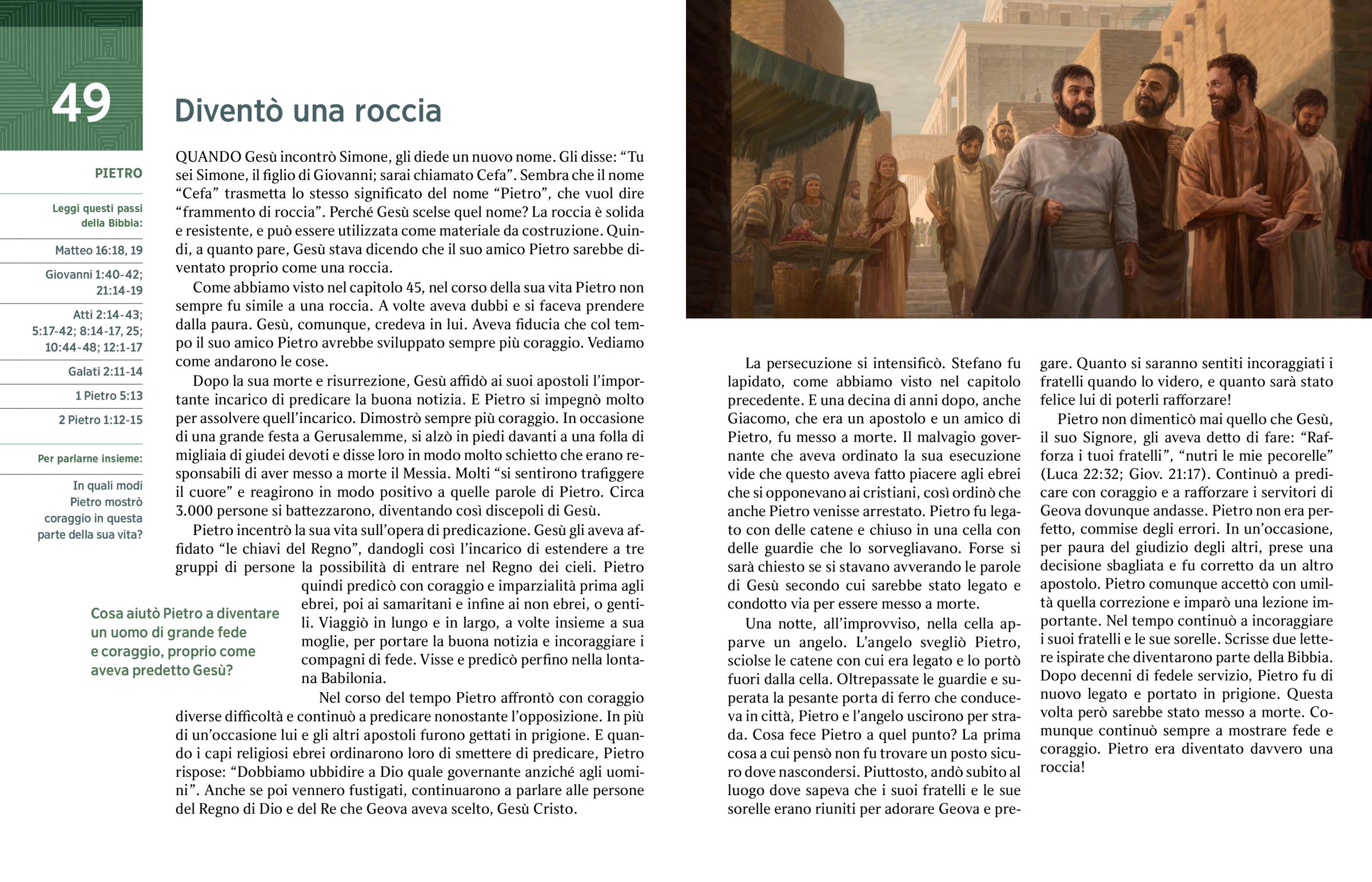 Pietro non dimenticò mai quello che Gesù, il suo Signore, gli aveva detto di fare: “Rafforza i tuoi fratelli”, “nutri le mie pecorelle” (Luca 22:32; Giov. 21:17). Continuò a predicare con coraggio e a rafforzare i servitori di Geova dovunque andasse. Pietro non era perfetto, commise degli errori. In un’occasione, per paura del giudizio degli altri, prese una decisione sbagliata e fu corretto da un altro apostolo. Pietro comunque accettò con umiltà quella correzione e imparò una lezione importante. Nel tempo continuò a incoraggiare i suoi fratelli e le sue sorelle. Scrisse due lettere ispirate che diventarono parte della Bibbia. Dopo decenni di fedele servizio, Pietro fu di nuovo legato e portato in prigione. Questa volta però sarebbe stato messo a morte. Comunque continuò sempre a mostrare fede e coraggio. Pietro era diventato davvero una roccia!