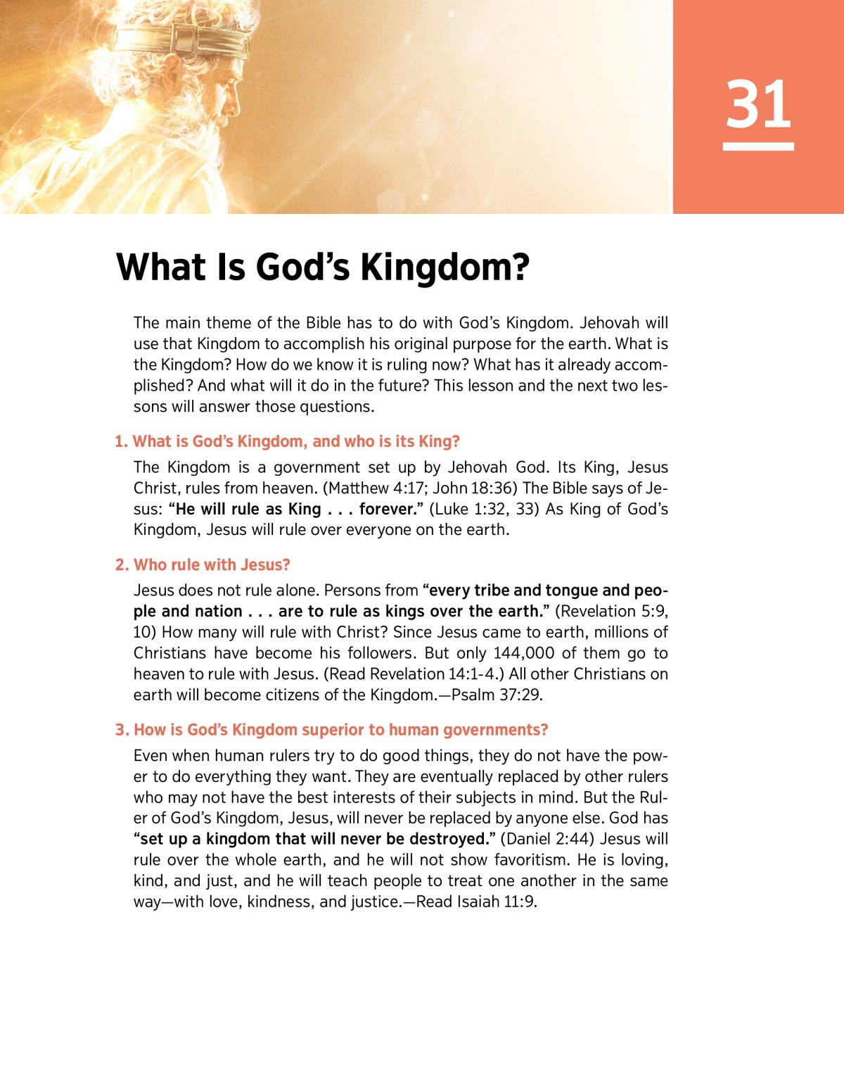 The main theme of the Bible has to do with God’s Kingdom. Jehovah will use that Kingdom to accomplish his original purpose for the earth. What is the Kingdom? How do we know it is ruling now? What has it already accomplished? And what will it do in the future? This lesson and the next two lessons will answer those questions.