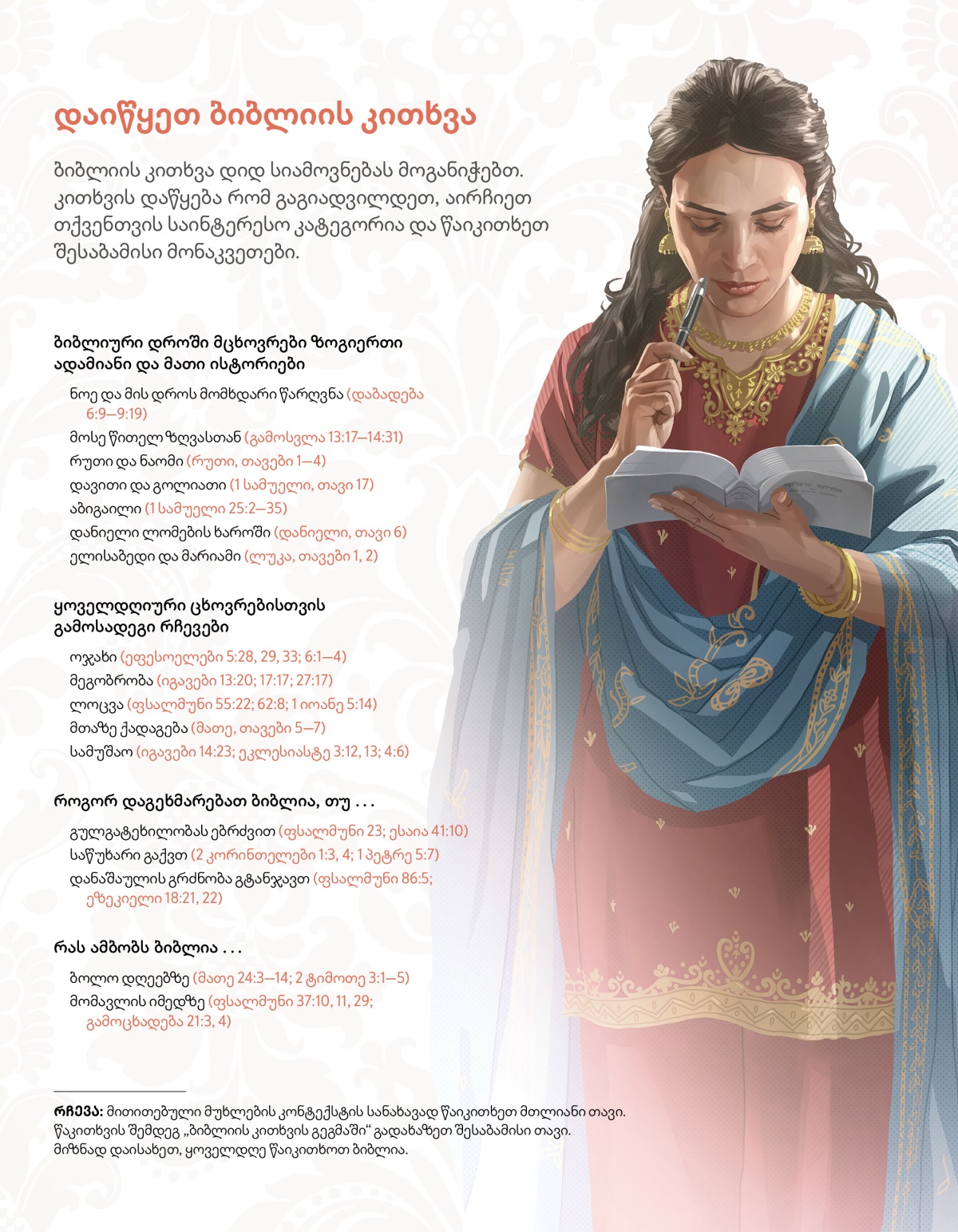 ბიბლიის კითხვა დიდ სიამოვნებას მოგანიჭებთ. კითხვის დაწყება რომ გაგიადვილდეთ, აირჩიეთ თქვენთვის საინტერესო კატეგორია და წაიკითხეთ შესაბამისი მონაკვეთები.