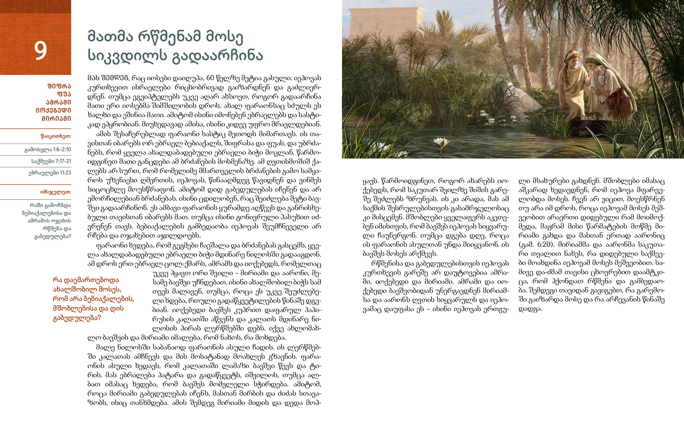 მალე ნილოსში საბანაოდ ფარაონის ასული ჩადის. ის ლერწმებში კალათას ამჩნევს და მის მოსატანად მოახლეს გზავნის. ფარაონის ასული ხედავს, რომ კალათაში ლამაზი ბავშვი წევს და ტირის. მას ებრალება პატარა და გადაწყვეტს, იშვილოს, თუმცა ალბათ იმასაც ხვდება, რომ ბავშვს მომვლელი სჭირდება. ამიტომ, როცა მირიამი გაბედულებას იჩენს, მასთან მირბის და ძიძას სთავაზობს, ისიც თანხმდება. ამის შემდეგ მირიამი მიდის და დედა მოჰყავს. წარმოიდგინეთ, როგორ ახარებს იოქებედს, რომ საკუთარ შვილზე შიშის გარეშე შეძლებს ზრუნვას. ის კი არადა, მას ამ საქმის შესრულებისთვის გასამრჯელოსაც კი მისცემენ. მშობლები ყველაფერს აკეთებენ იმისთვის, რომ ბავშვს იეჰოვას სიყვარული ჩაუნერგონ. თუმცა დგება დღე, როცა ის ფარაონის ასულთან უნდა მიიყვანონ. ის ბავშვს მოსეს არქმევს.