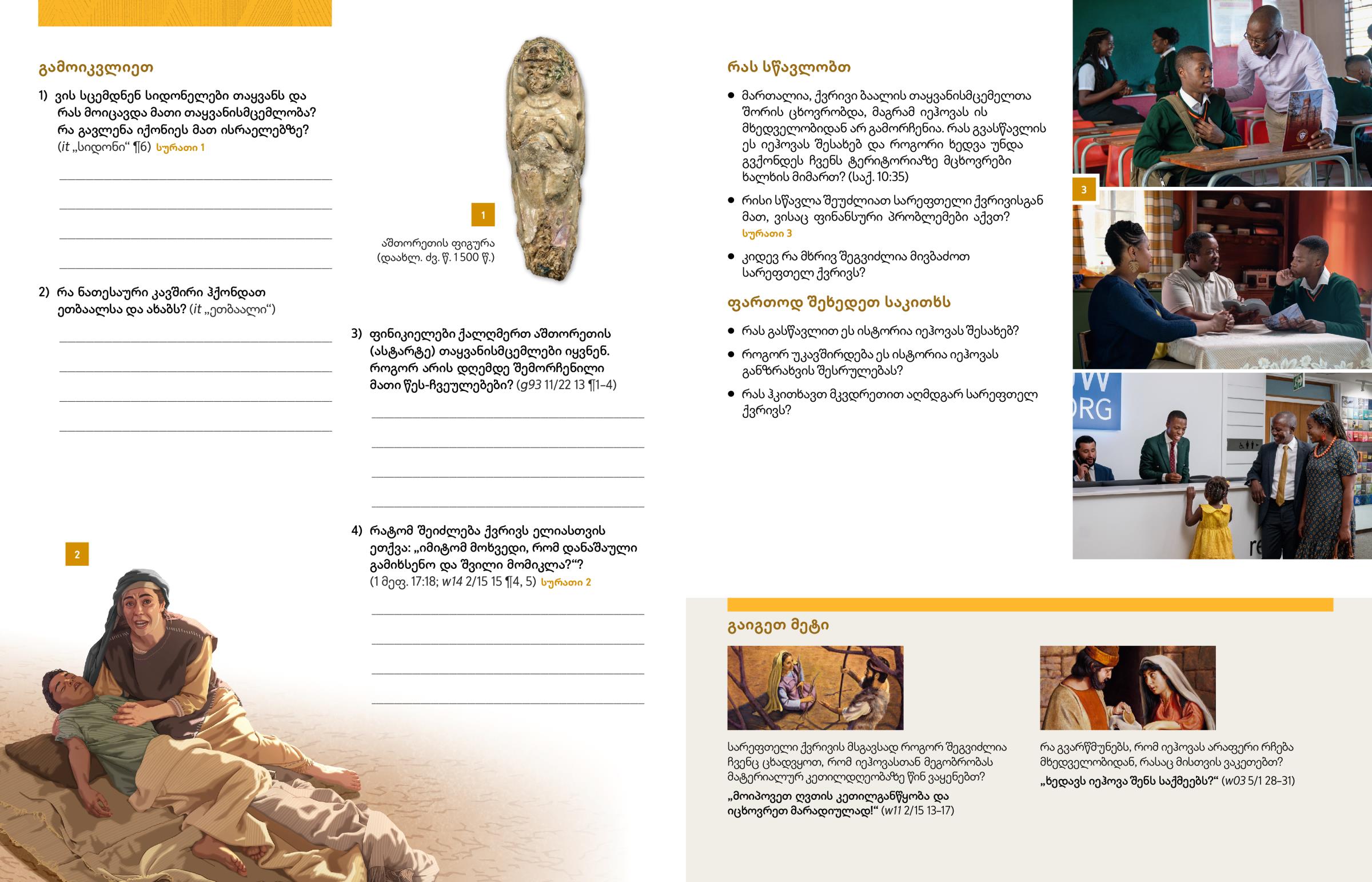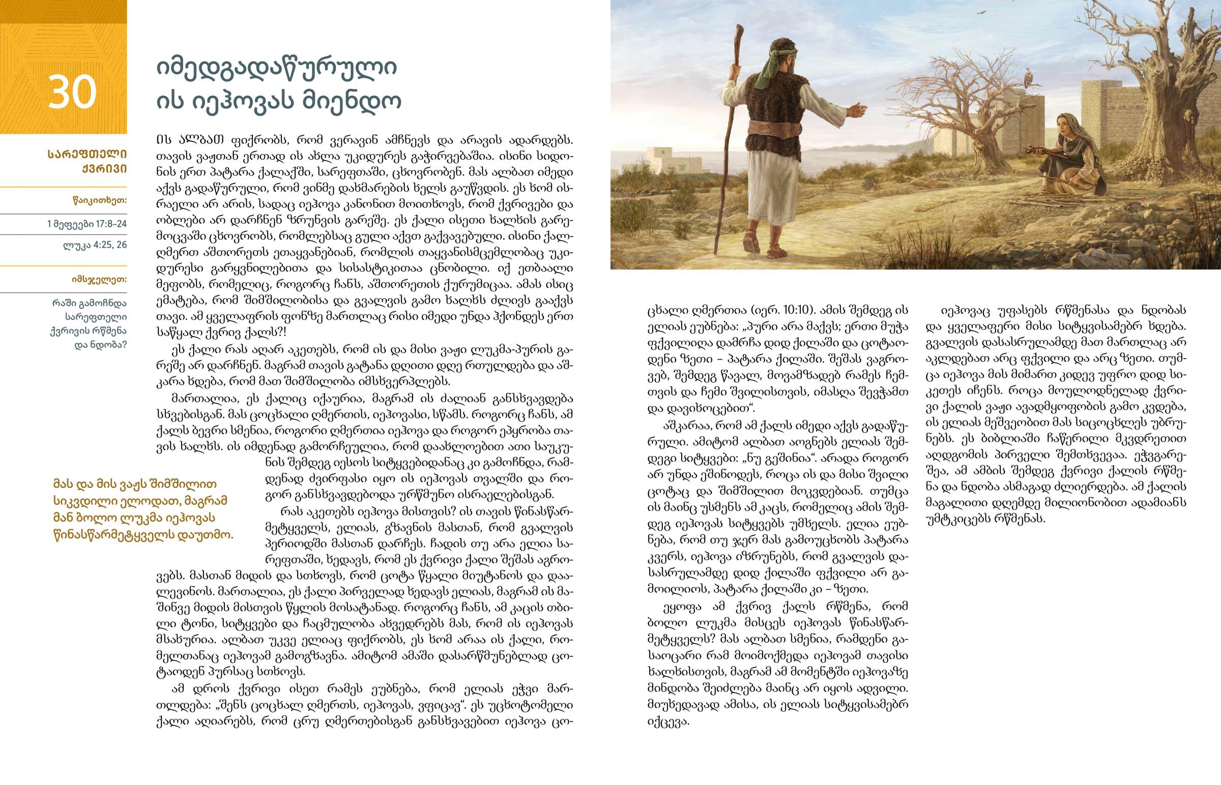 4) რატომ შეიძლება ქვრივს ელიასთვის ეთქვა: „იმიტომ მოხვედი, რომ დანაშაული გამიხსენო და შვილი მომიკლა?“? (1 მეფ. 17:18; w14 2/15 15 ¶4, 5) სურათი 2