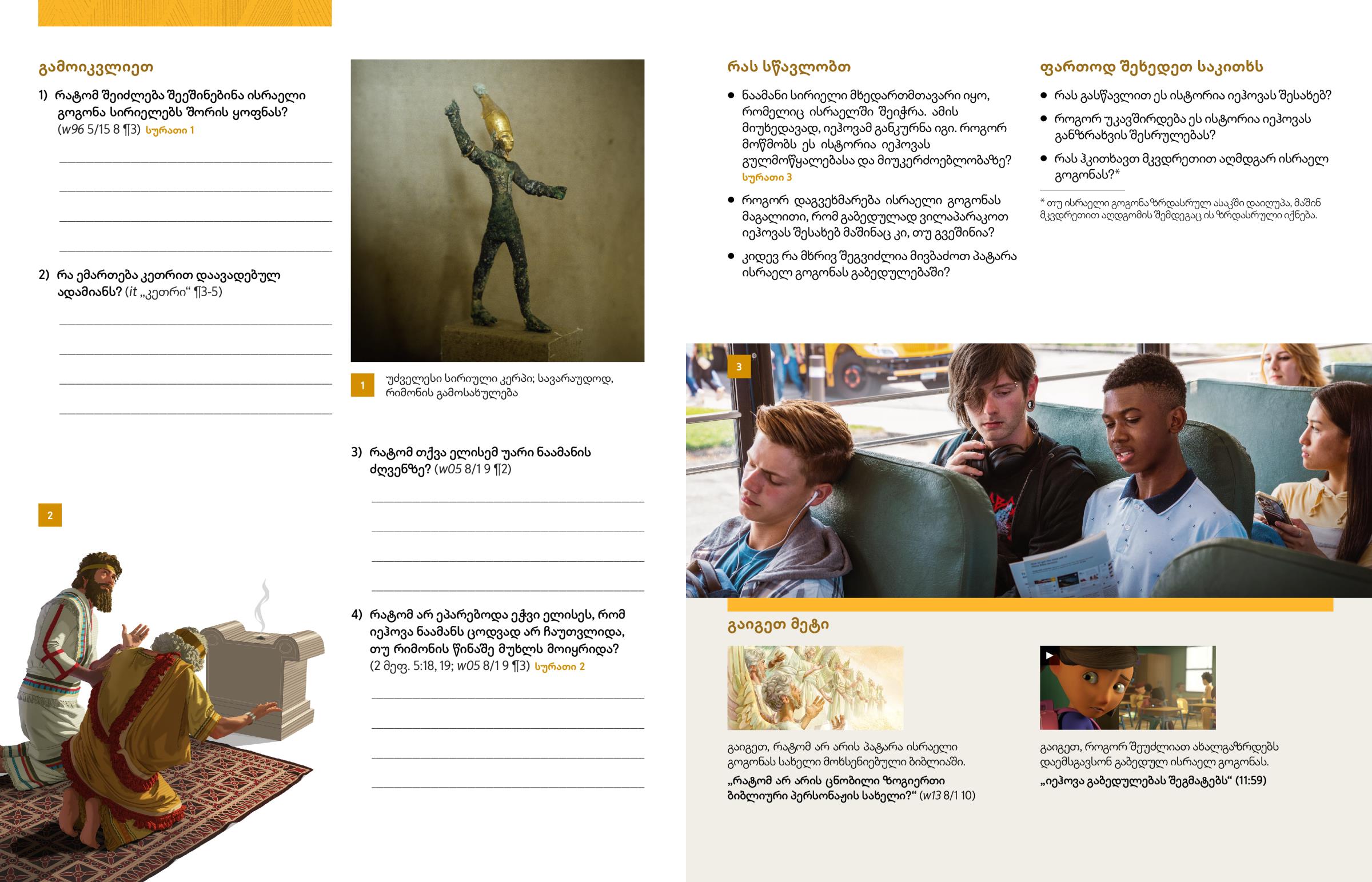 4) რატომ არ ეპარებოდა ეჭვი ელისეს, რომ იეჰოვა ნაამანს ცოდვად არ ჩაუთვლიდა, თუ რიმონის წინაშე მუხლს მოიყრიდა? (2 მეფ. 5:18, 19; w05 8/1 9 ¶3) სურათი 2