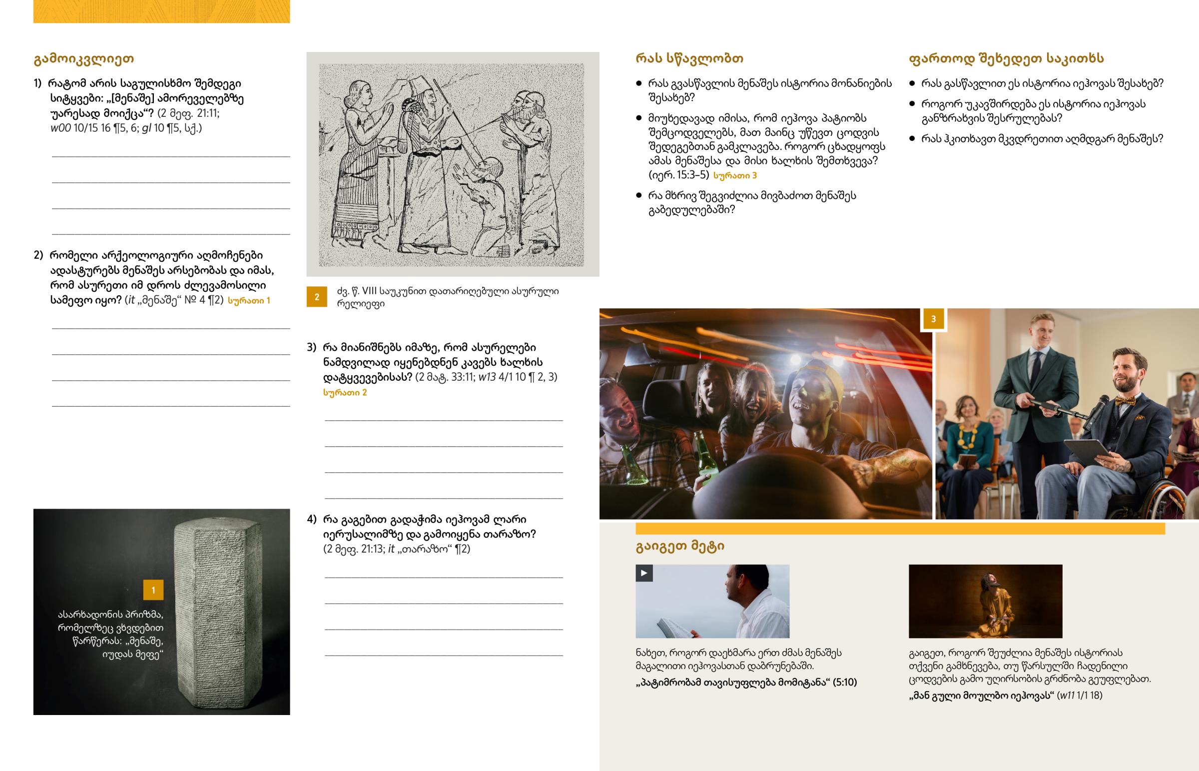 1) რატომ არის საგულისხმო შემდეგი სიტყვები: „[მენაშე] ამორეველებზე უარესად მოიქცა“? (2 მეფ. 21:11; w00 10/15 16 ¶5, 6; gl 10 ¶5, სქ.)