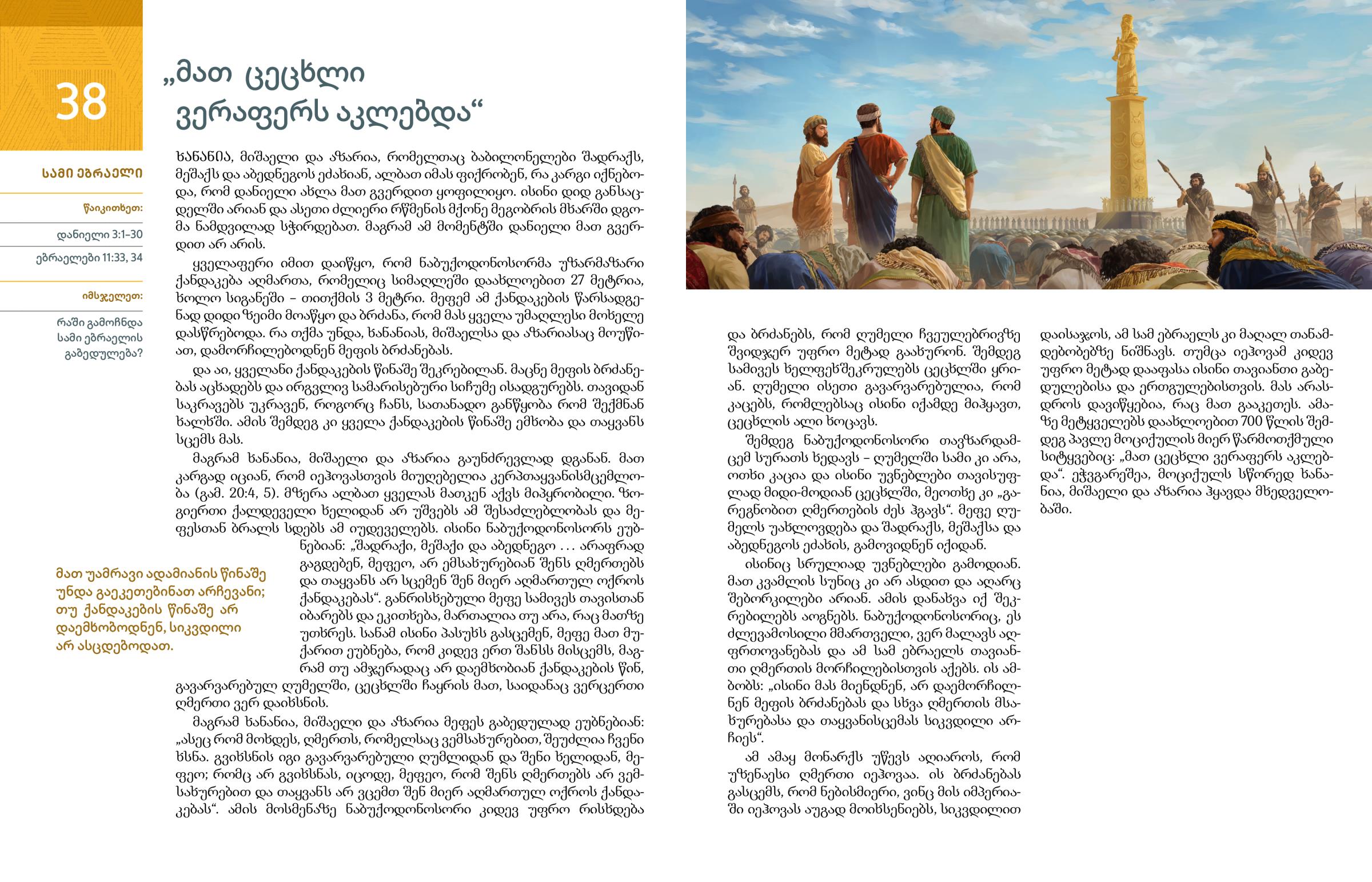 ᲮᲐᲜᲐᲜᲘᲐ, მიშაელი და აზარია, რომელთაც ბაბილონელები შადრაქს, მეშაქს და აბედნეგოს ეძახიან, ალბათ იმას ფიქრობენ, რა კარგი იქნებოდა, რომ დანიელი ახლა მათ გვერდით ყოფილიყო. ისინი დიდ განსაცდელში არიან და ასეთი ძლიერი რწმენის მქონე მეგობრის მხარში დგომა ნამდვილად სჭირდებათ. მაგრამ ამ მომენტში დანიელი მათ გვერდით არ არის.