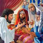 საინტერესოა, როგორ რეაგირებენ იესოს სიტყვებზე ფარისევლები და მწიგნობრები. ისინი აღშფოთებას ვერ მალავენ და სახლიდან გამოსულ იესოს კითხვას კითხვაზე უსვამენ. მათ მისგან რამის სწავლა კი არ სურთ, არამედ მახეს უგებენ, რომ ისეთი რამ ათქმევინონ, რაც მისი დაპატიმრების საბაბს მისცემთ.
