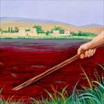 დააკვირდი სურათებს. მათზე ნაჩვენებია ის სასჯელები, რომლებიც იეჰოვამ დაატეხა ეგვიპტეს. პირველ სურათზე ხედავ, რომ აარონმა მდინარე ნილოსს ჯოხი დაჰკრა და წყალი სისხლად იქცა. თევზები დაიხოცნენ და მდინარე აყროლდა.