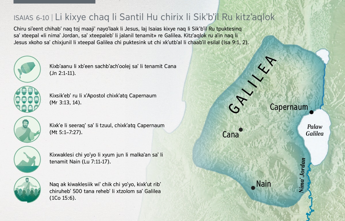 Chiru siʼeent chihabʼ naq toj maajiʼ nayoʼlaak li Jesus, laj Isaias kixye naq li Sikʼbʼil Ru tpuktesinq saʼ xteepal «li nimaʼ Jordan, saʼ xteepalebʼ li jalanil tenamit» re Galilea. Kitzʼaqlok ru aʼin naq li Jesus xkoho saʼ chixjunil li xteepal Galilea chi puktesink ut chi xkʼutbʼal li chaabʼil esilal (Isa 9:1, 2).