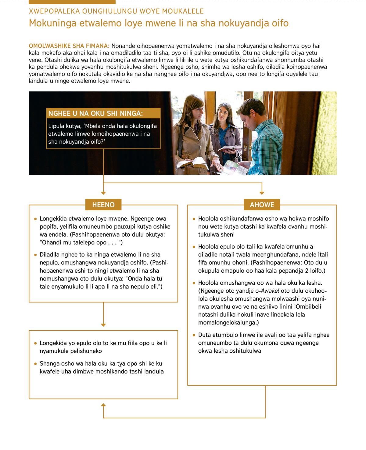 • Xwepopaleka ounghulungu woye moukalele—Mokuninga etwalemo loye mwene li na sha nokuyandja oifo