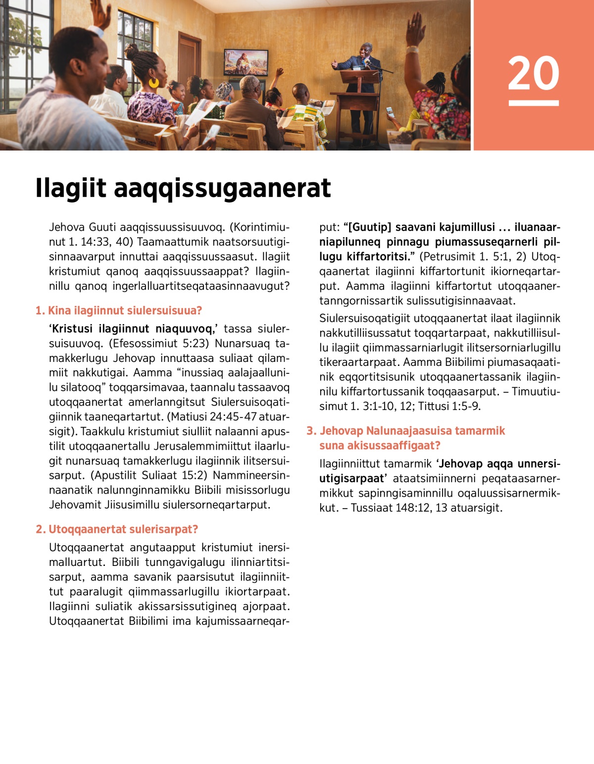 Jehova Guuti aaqqissuussisuuvoq. (Korintimiunut 1. 14:33, 40) Taamaattumik naatsorsuutigisinnaavarput innuttai aaqqissuussaasut. Ilagiit kristumiut qanoq aaqqissuussaappat? Ilagiinnillu qanoq ingerlalluartitseqataasinnaavugut?