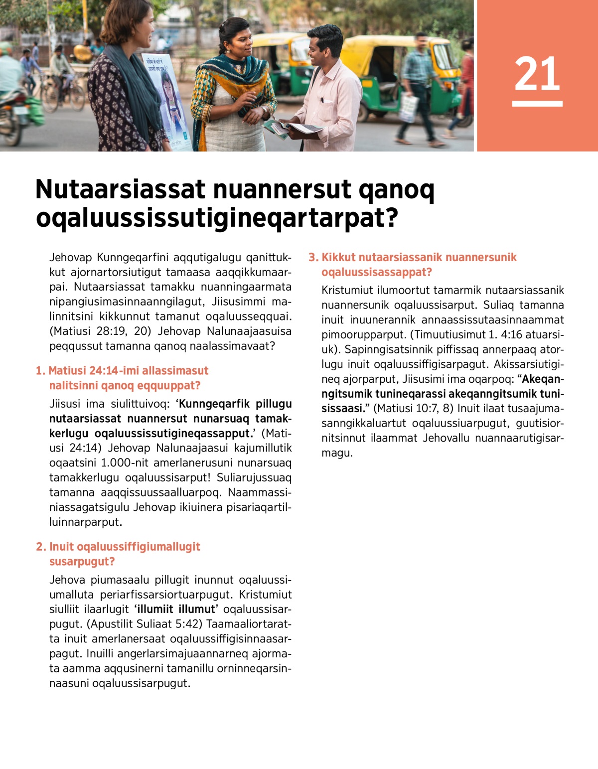 Jiisusi ima siulittuivoq: ‘Kunngeqarfik pillugu nutaarsiassat nuannersut nunarsuaq tamakkerlugu oqaluussissutigineqassapput.’ (Matiusi 24:14) Jehovap Nalunaajaasui kajumillutik oqaatsini 1.000-nit amerlanerusuni nunarsuaq tamakkerlugu oqaluussisarput! Suliarujussuaq tamanna aaqqissuussaalluarpoq. Naammassiniassagatsigulu Jehovap ikiuinera pisariaqartilluinnarparput.