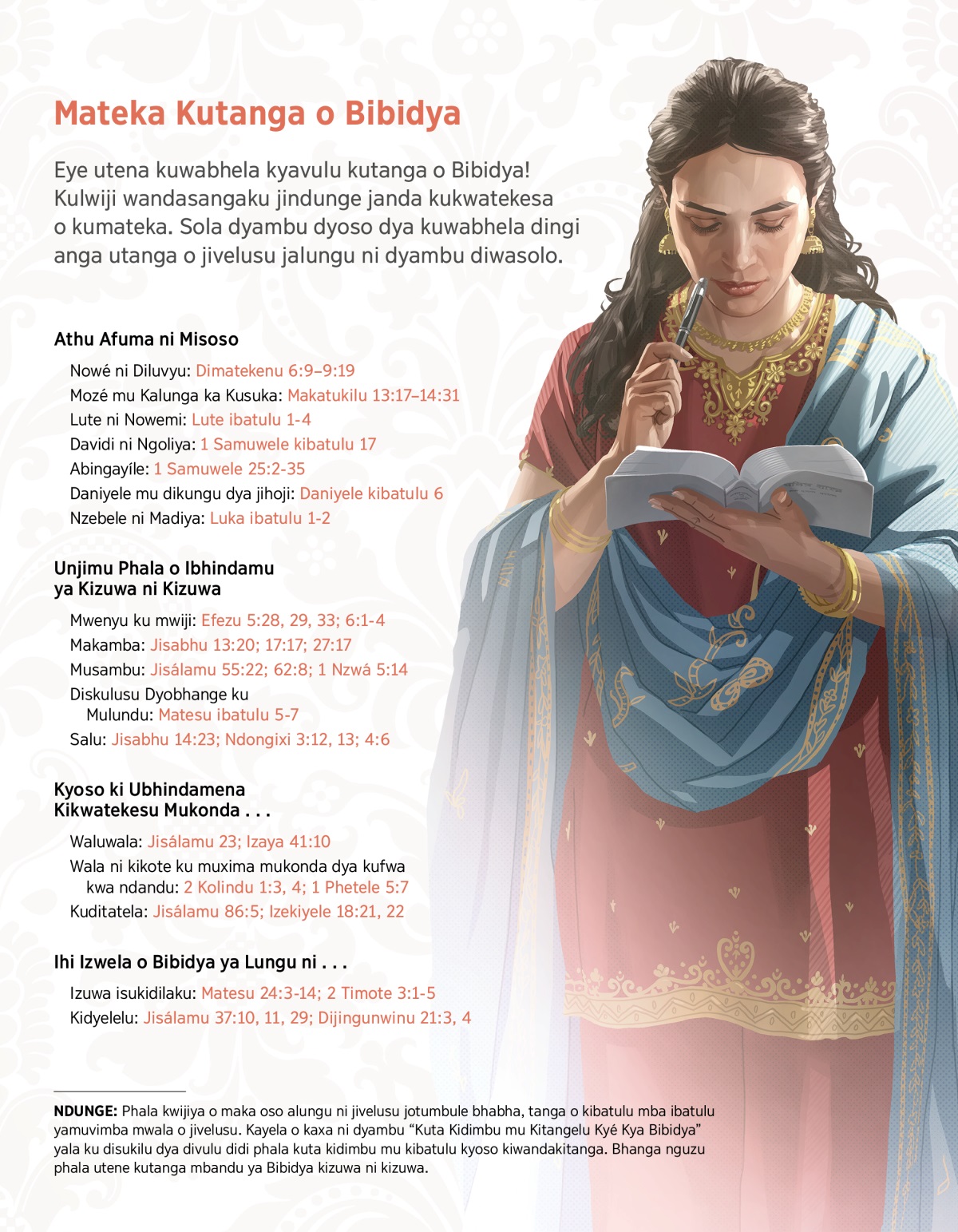 NDUNGE: Phala kwijiya o maka oso alungu ni jivelusu jotumbule bhabha, tanga o kibatulu mba ibatulu yamuvimba mwala o jivelusu. Kayela o kaxa ni dyambu “Kuta Kidimbu mu Kitangelu Kyé Kya Bibidya” yala ku disukilu dya divulu didi phala kuta kidimbu mu kibatulu kyoso kiwandakitanga. Bhanga nguzu phala utene kutanga mbandu ya Bibidya kizuwa ni kizuwa.