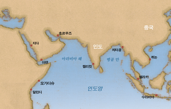 “우리는 십만 리a가 넘는 광대한 바닷길을 다녔네. 대양을 바라보니 산처럼 큰 파도는 하늘에 닿았고, 저 멀리 오랑캐의 땅이 보이네. ··· 구름 같은 돛을 높이 펼치고 밤낮을 유성처럼 달려 광란의 파도를 건너가는데 마치 큰길을 걷는 것과 같도다.”—15세기에 정화가 남겼다고 하는 비문, 중국 푸젠 성 창러.