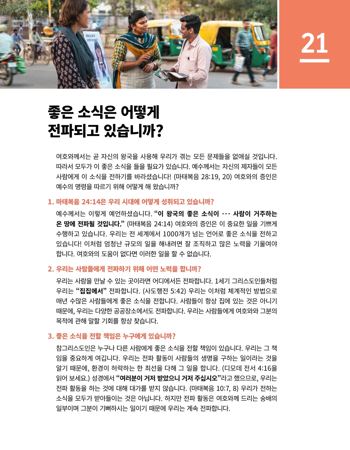 예수께서는 이렇게 예언하셨습니다. “이 왕국의 좋은 소식이 ··· 사람이 거주하는 온 땅에 전파될 것입니다.” (마태복음 24:14) 여호와의 증인은 이 중요한 일을 기쁘게 수행하고 있습니다. 우리는 전 세계에서 1000개가 넘는 언어로 좋은 소식을 전하고 있습니다! 이처럼 엄청난 규모의 일을 해내려면 잘 조직하고 많은 노력을 기울여야 합니다. 여호와의 도움이 없다면 이러한 일을 할 수 없습니다.