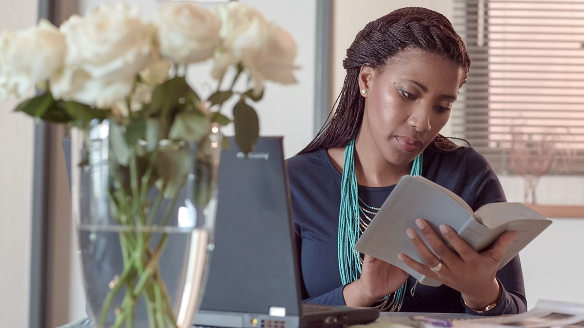 그 여자가 성경과 성경 출판물과 컴퓨터로 조사를 합니다.