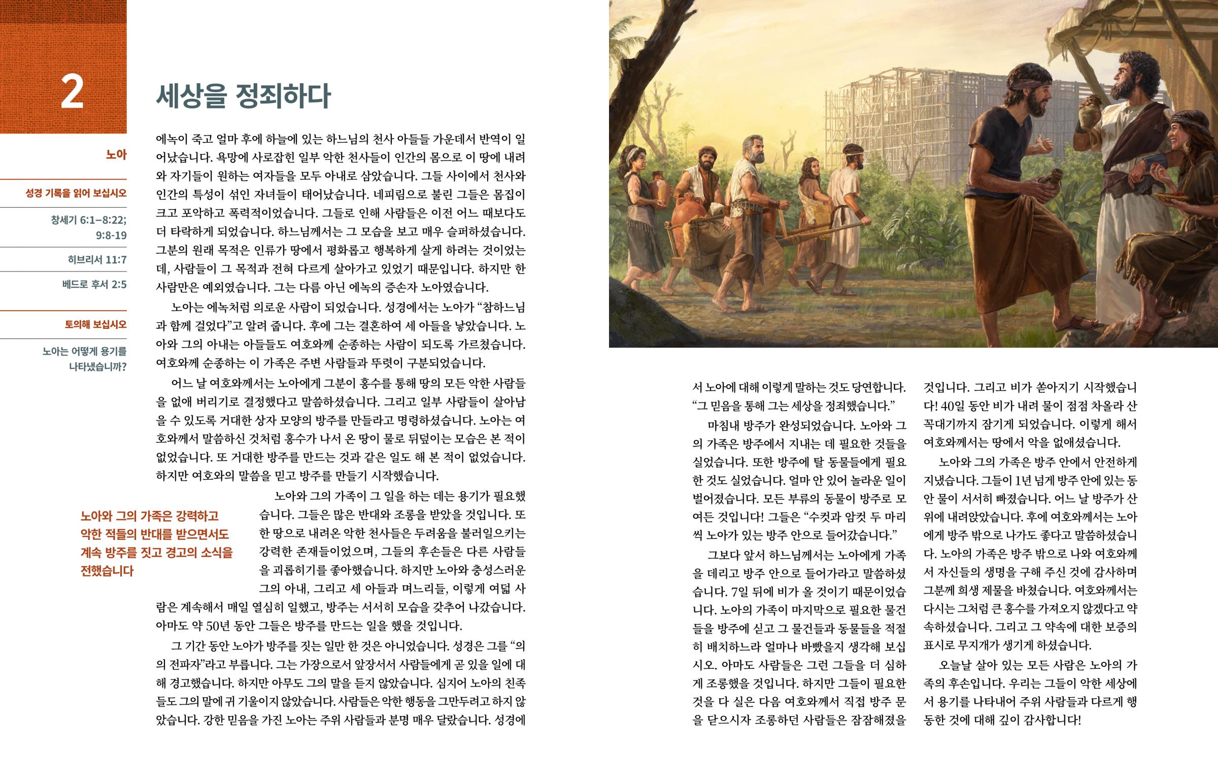 어느 날 여호와께서는 노아에게 그분이 홍수를 통해 땅의 모든 악한 사람들을 없애 버리기로 결정했다고 말씀하셨습니다. 그리고 일부 사람들이 살아남을 수 있도록 거대한 상자 모양의 방주를 만들라고 명령하셨습니다. 노아는 여호와께서 말씀하신 것처럼 홍수가 나서 온 땅이 물로 뒤덮이는 모습은 본 적이 없었습니다. 또 거대한 방주를 만드는 것과 같은 일도 해 본 적이 없었습니다. 하지만 여호와의 말씀을 믿고 방주를 만들기 시작했습니다.