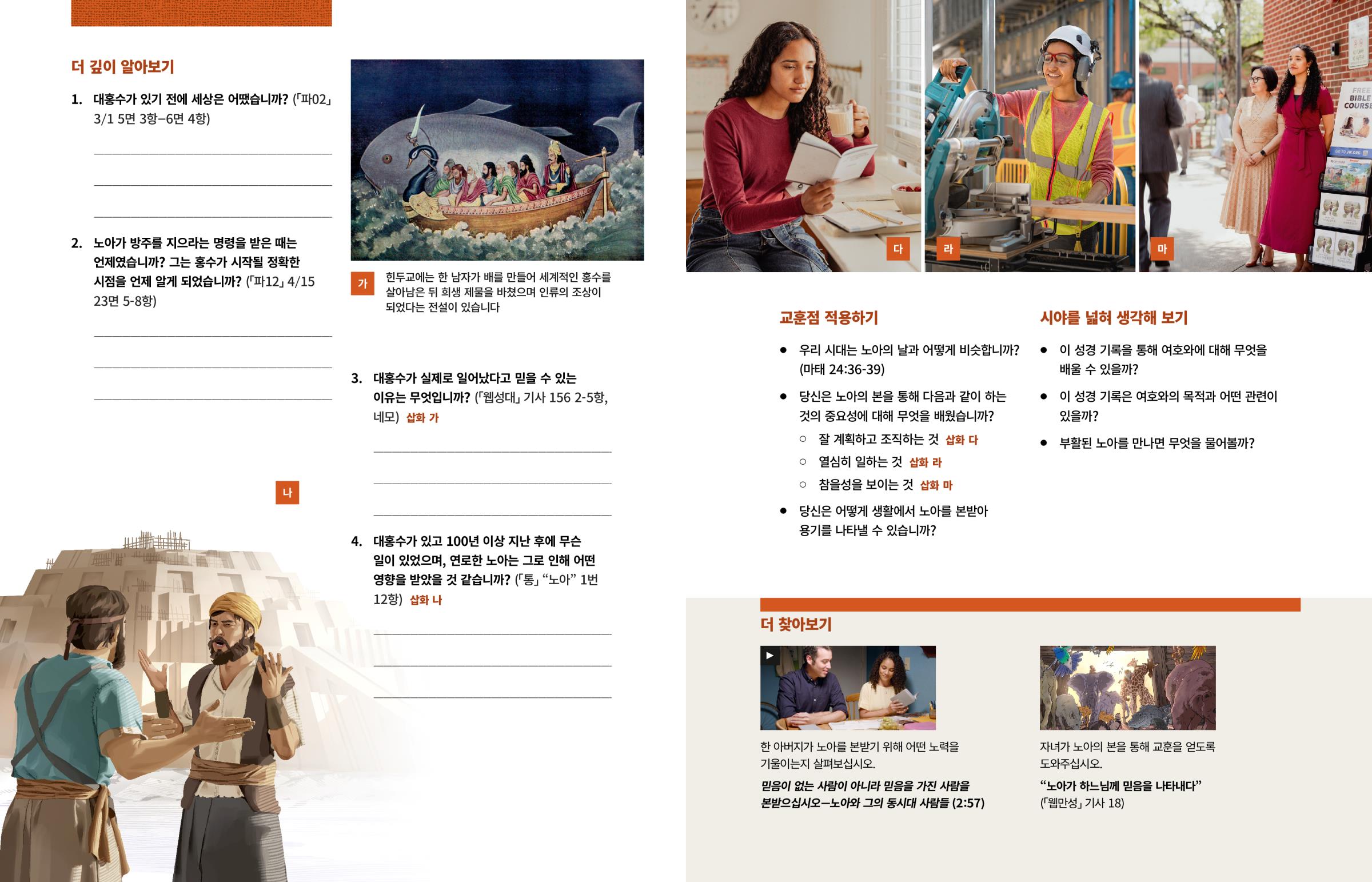 오늘날 살아 있는 모든 사람은 노아의 가족의 후손입니다. 우리는 그들이 악한 세상에서 용기를 나타내어 주위 사람들과 다르게 행동한 것에 대해 깊이 감사합니다!