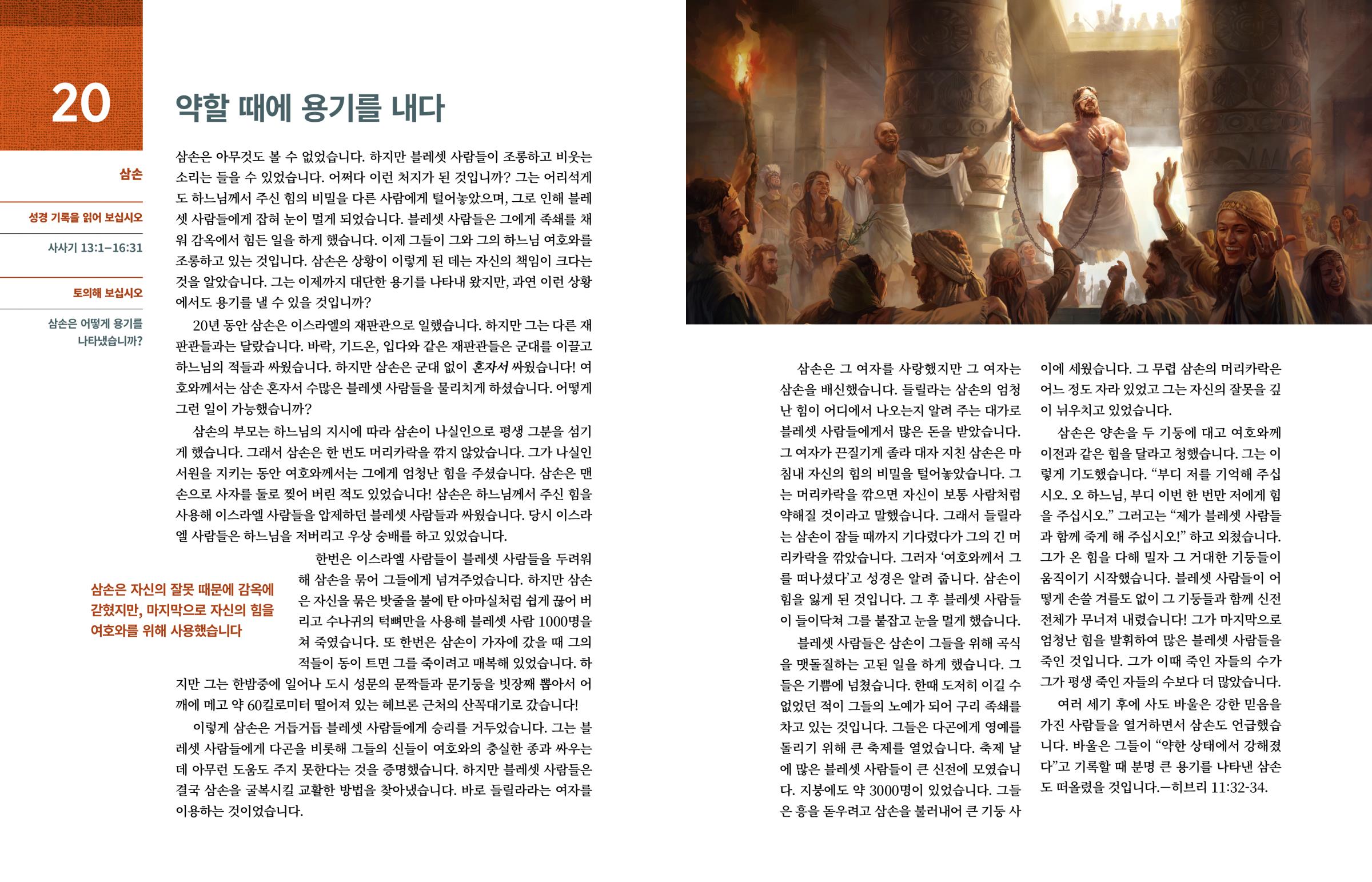 삼손은 양손을 두 기둥에 대고 여호와께 이전과 같은 힘을 달라고 청했습니다. 그는 이렇게 기도했습니다. “부디 저를 기억해 주십시오. 오 하느님, 부디 이번 한 번만 저에게 힘을 주십시오.” 그러고는 “제가 블레셋 사람들과 함께 죽게 해 주십시오!” 하고 외쳤습니다. 그가 온 힘을 다해 밀자 그 거대한 기둥들이 움직이기 시작했습니다. 블레셋 사람들이 어떻게 손쓸 겨를도 없이 그 기둥들과 함께 신전 전체가 무너져 내렸습니다! 그가 마지막으로 엄청난 힘을 발휘하여 많은 블레셋 사람들을 죽인 것입니다. 그가 이때 죽인 자들의 수가 그가 평생 죽인 자들의 수보다 더 많았습니다.