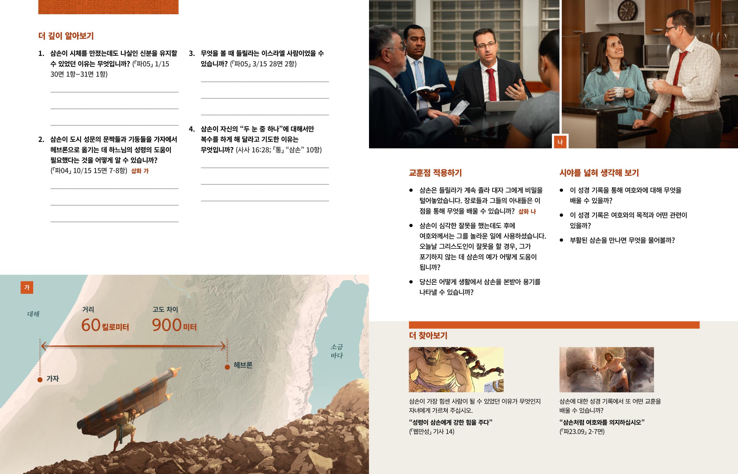 2. 삼손이 도시 성문의 문짝들과 기둥들을 가자에서 헤브론으로 옮기는 데 하느님의 성령의 도움이 필요했다는 것을 어떻게 알 수 있습니까? (「파04」 10/15 15면 7-8항) 삽화 가