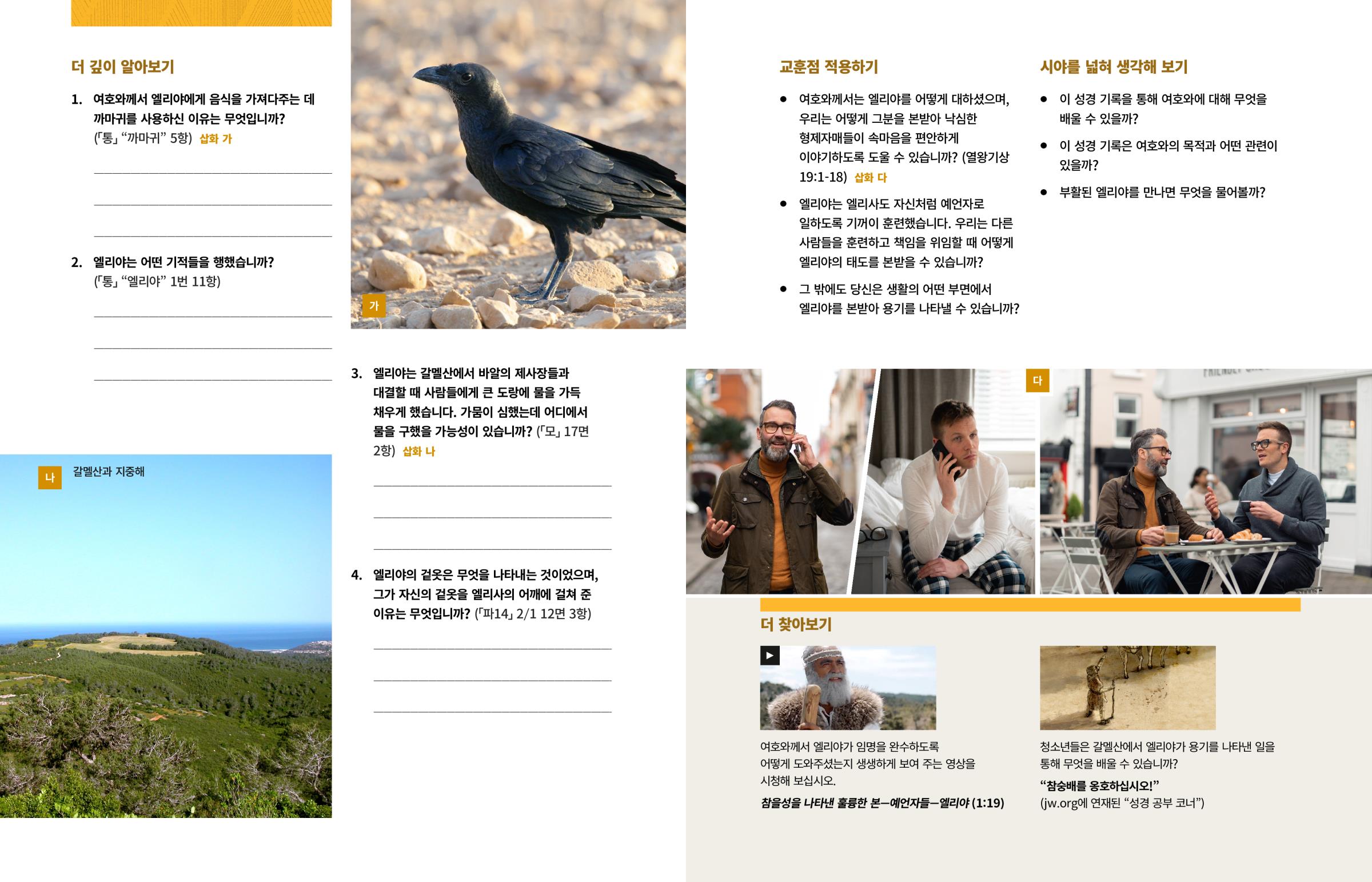 1. 여호와께서 엘리야에게 음식을 가져다주는 데 까마귀를 사용하신 이유는 무엇입니까? (「통」 “까마귀” 5항) 삽화 가