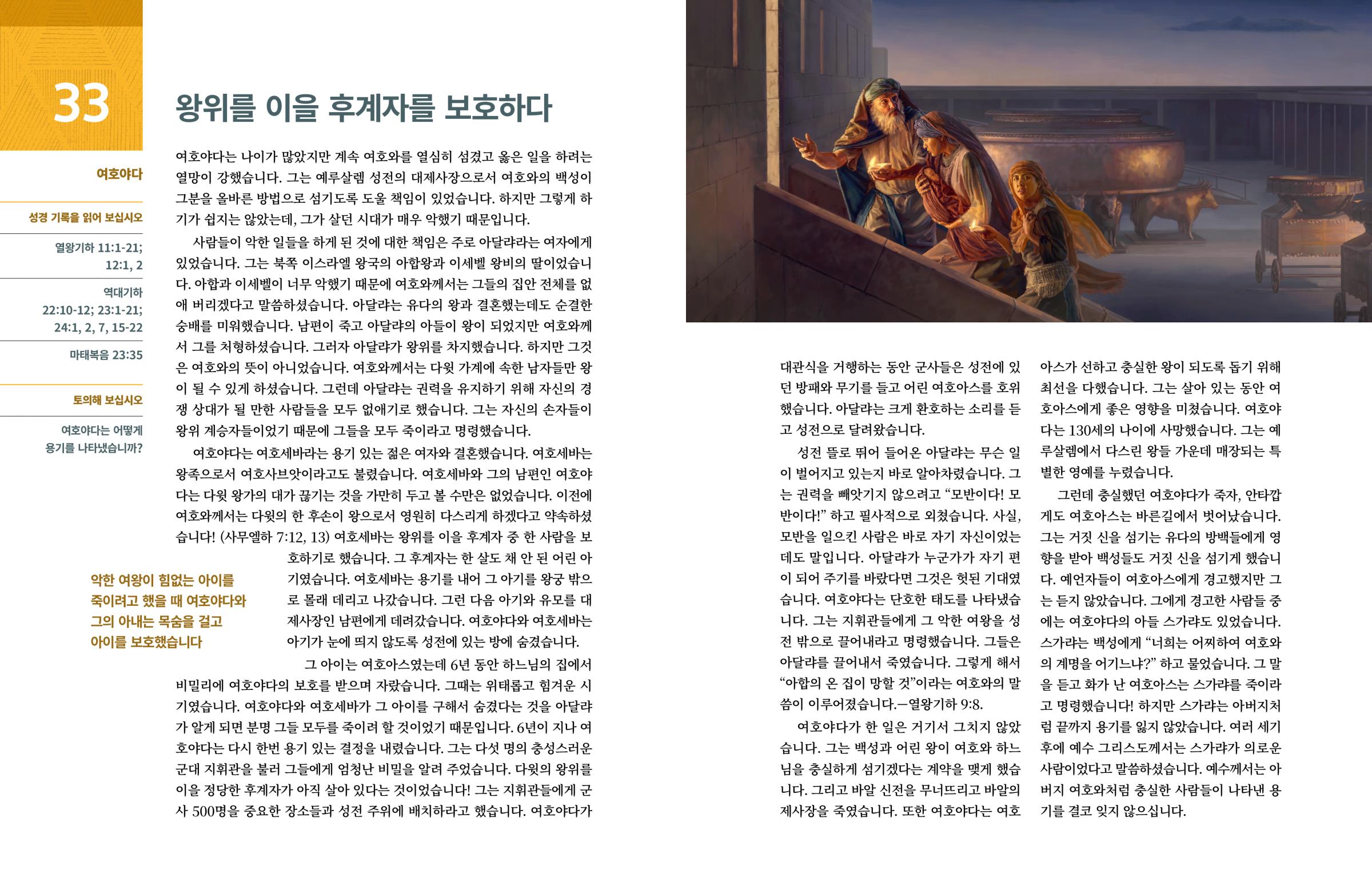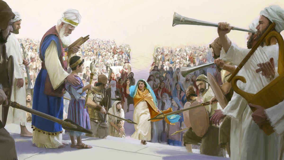 그 아이는 여호아스였는데 6년 동안 하느님의 집에서 비밀리에 여호야다의 보호를 받으며 자랐습니다. 그때는 위태롭고 힘겨운 시기였습니다. 여호야다와 여호세바가 그 아이를 구해서 숨겼다는 것을 아달랴가 알게 되면 분명 그들 모두를 죽이려 할 것이었기 때문입니다. 6년이 지나 여호야다는 다시 한번 용기 있는 결정을 내렸습니다. 그는 다섯 명의 충성스러운 군대 지휘관을 불러 그들에게 엄청난 비밀을 알려 주었습니다. 다윗의 왕위를 이을 정당한 후계자가 아직 살아 있다는 것이었습니다! 그는 지휘관들에게 군사 500명을 중요한 장소들과 성전 주위에 배치하라고 했습니다. 여호야다가 대관식을 거행하는 동안 군사들은 성전에 있던 방패와 무기를 들고 어린 여호아스를 호위했습니다. 아달랴는 크게 환호하는 소리를 듣고 성전으로 달려왔습니다.