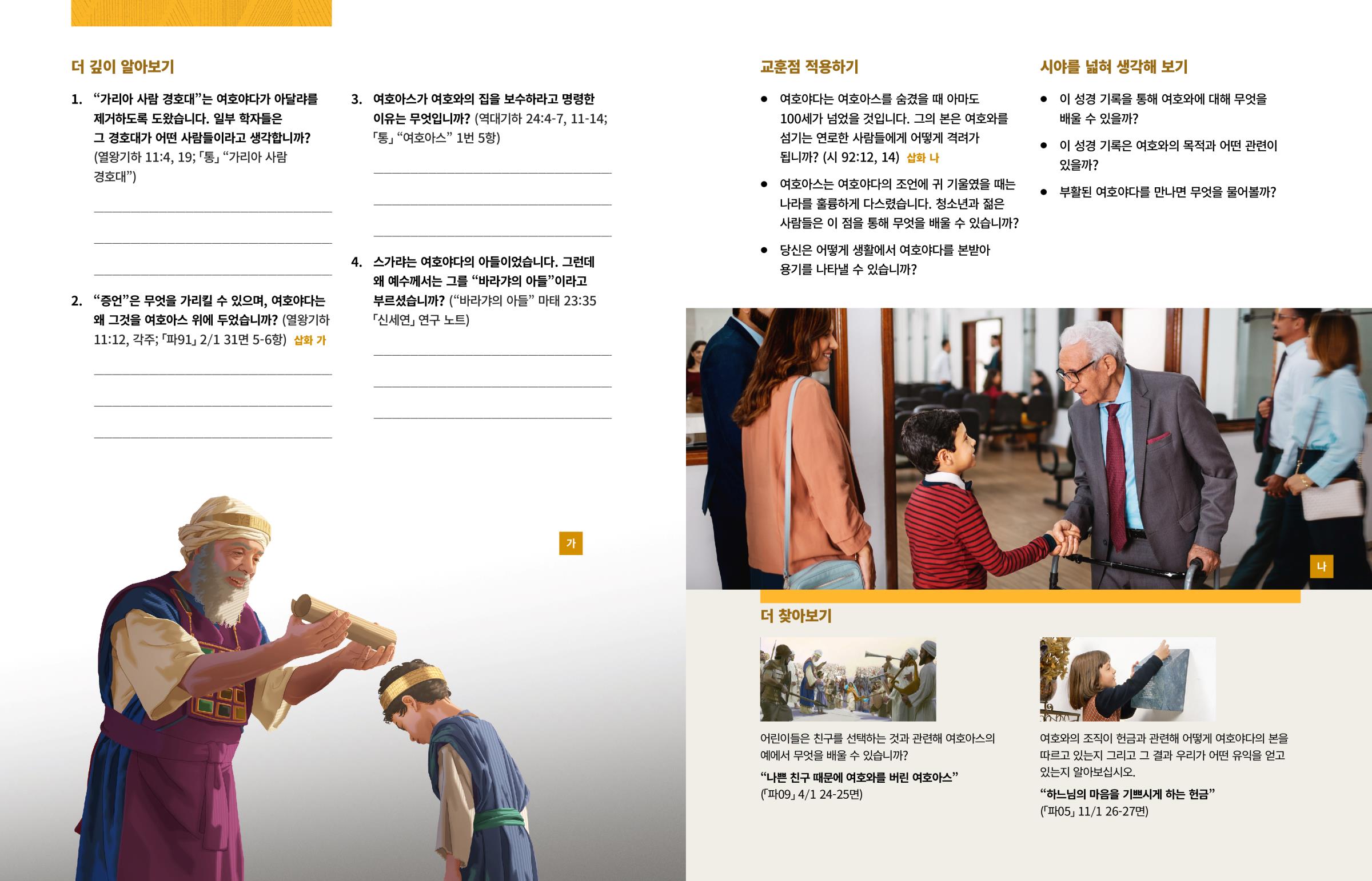 그런데 충실했던 여호야다가 죽자, 안타깝게도 여호아스는 바른길에서 벗어났습니다. 그는 거짓 신을 섬기는 유다의 방백들에게 영향을 받아 백성들도 거짓 신을 섬기게 했습니다. 예언자들이 여호아스에게 경고했지만 그는 듣지 않았습니다. 그에게 경고한 사람들 중에는 여호야다의 아들 스가랴도 있었습니다. 스가랴는 백성에게 “너희는 어찌하여 여호와의 계명을 어기느냐?” 하고 물었습니다. 그 말을 듣고 화가 난 여호아스는 스가랴를 죽이라고 명령했습니다! 하지만 스가랴는 아버지처럼 끝까지 용기를 잃지 않았습니다. 여러 세기 후에 예수 그리스도께서는 스가랴가 의로운 사람이었다고 말씀하셨습니다. 예수께서는 아버지 여호와처럼 충실한 사람들이 나타낸 용기를 결코 잊지 않으십니다.