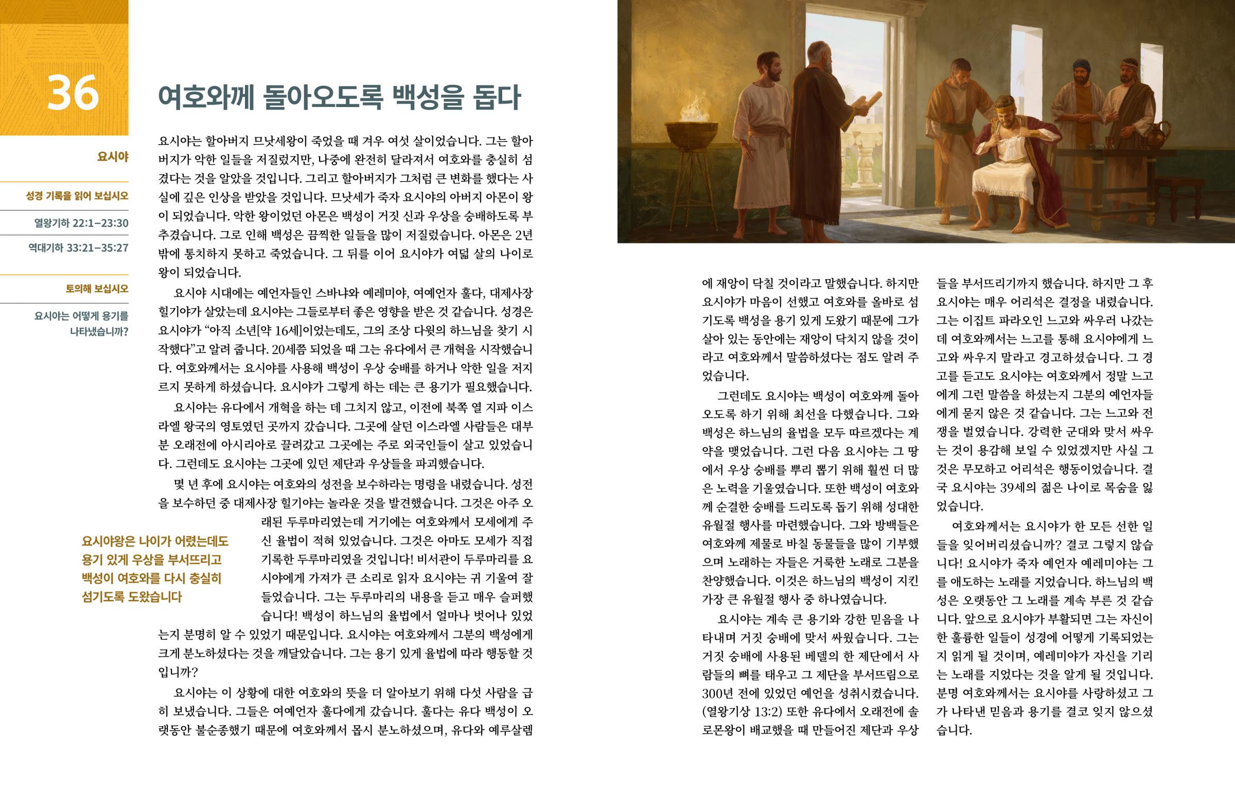 몇 년 후에 요시야는 여호와의 성전을 보수하라는 명령을 내렸습니다. 성전을 보수하던 중 대제사장 힐기야는 놀라운 것을 발견했습니다. 그것은 아주 오래된 두루마리였는데 거기에는 여호와께서 모세에게 주신 율법이 적혀 있었습니다. 그것은 아마도 모세가 직접 기록한 두루마리였을 것입니다! 비서관이 두루마리를 요시야에게 가져가 큰 소리로 읽자 요시야는 귀 기울여 잘 들었습니다. 그는 두루마리의 내용을 듣고 매우 슬퍼했습니다! 백성이 하느님의 율법에서 얼마나 벗어나 있었는지 분명히 알 수 있었기 때문입니다. 요시야는 여호와께서 그분의 백성에게 크게 분노하셨다는 것을 깨달았습니다. 그는 용기 있게 율법에 따라 행동할 것입니까?