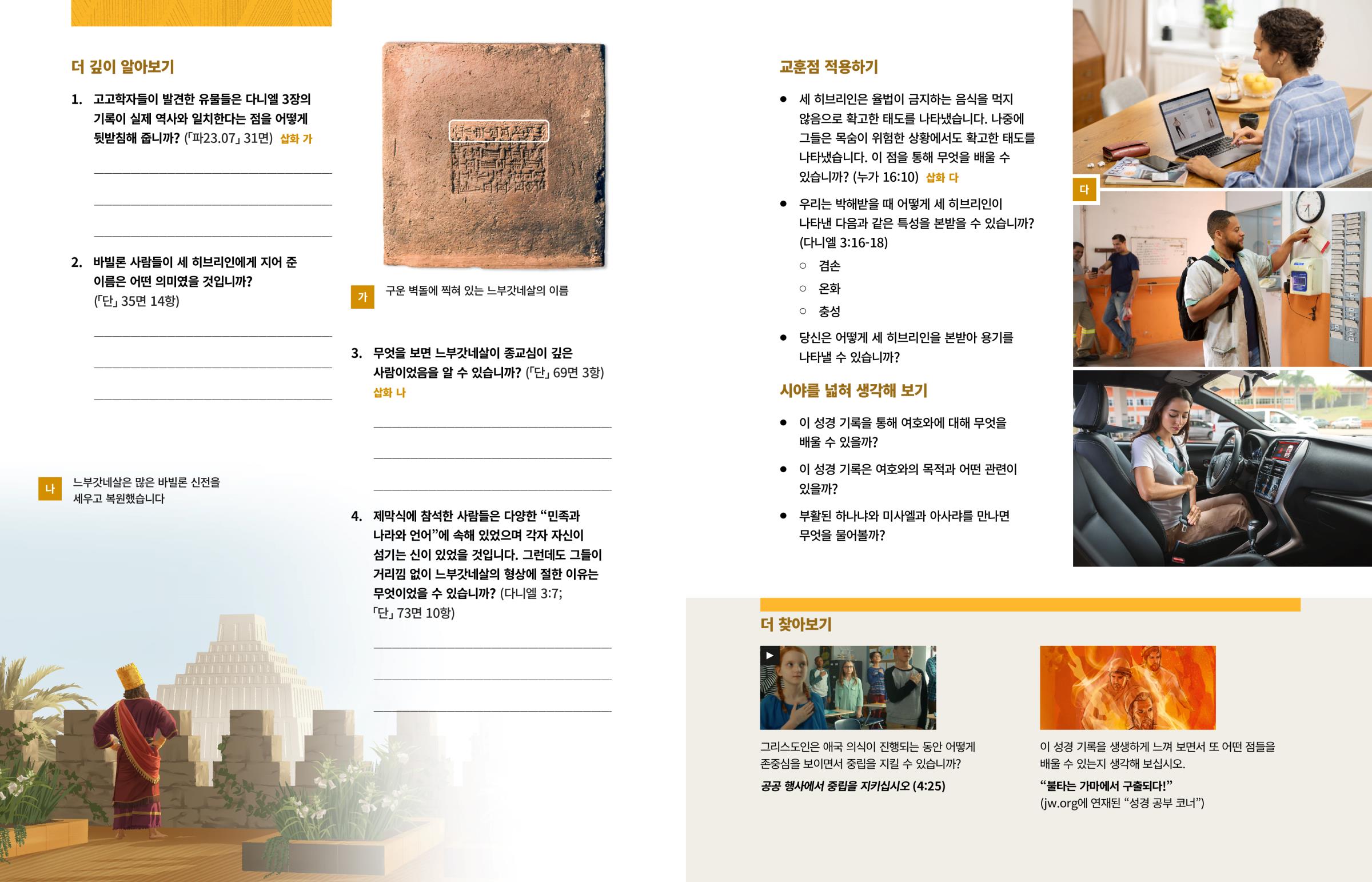 1. 고고학자들이 발견한 유물들은 다니엘 3장의 기록이 실제 역사와 일치한다는 점을 어떻게 뒷받침해 줍니까? (「파23.07」 31면) 삽화 가