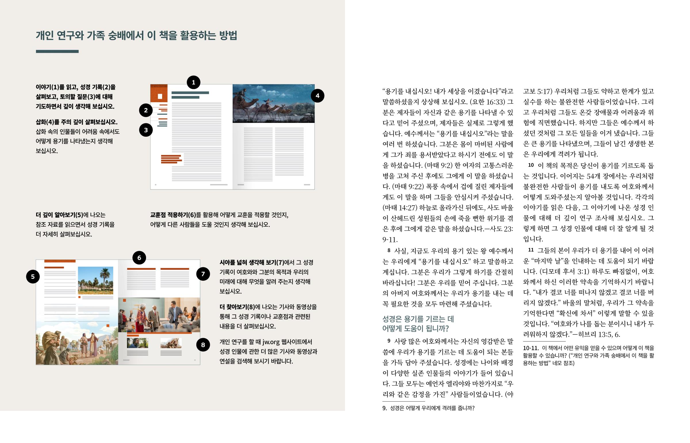 10 이 책의 목적은 당신이 용기를 기르도록 돕는 것입니다. 이어지는 54개 장에서는 우리처럼 불완전한 사람들이 용기를 내도록 여호와께서 어떻게 도와주셨는지 알아볼 것입니다. 각각의 이야기를 읽은 다음, 그 이야기에 나온 성경 인물에 대해 더 깊이 연구 조사해 보십시오. 그렇게 하면 그 성경 인물에 대해 더 잘 알게 될 것입니다.