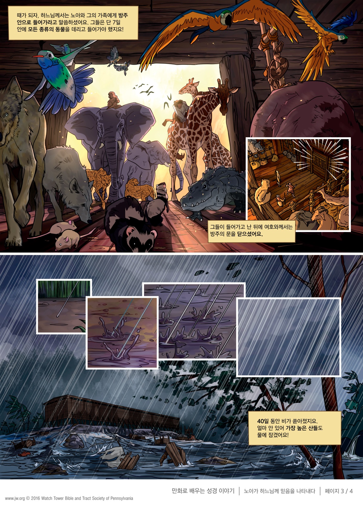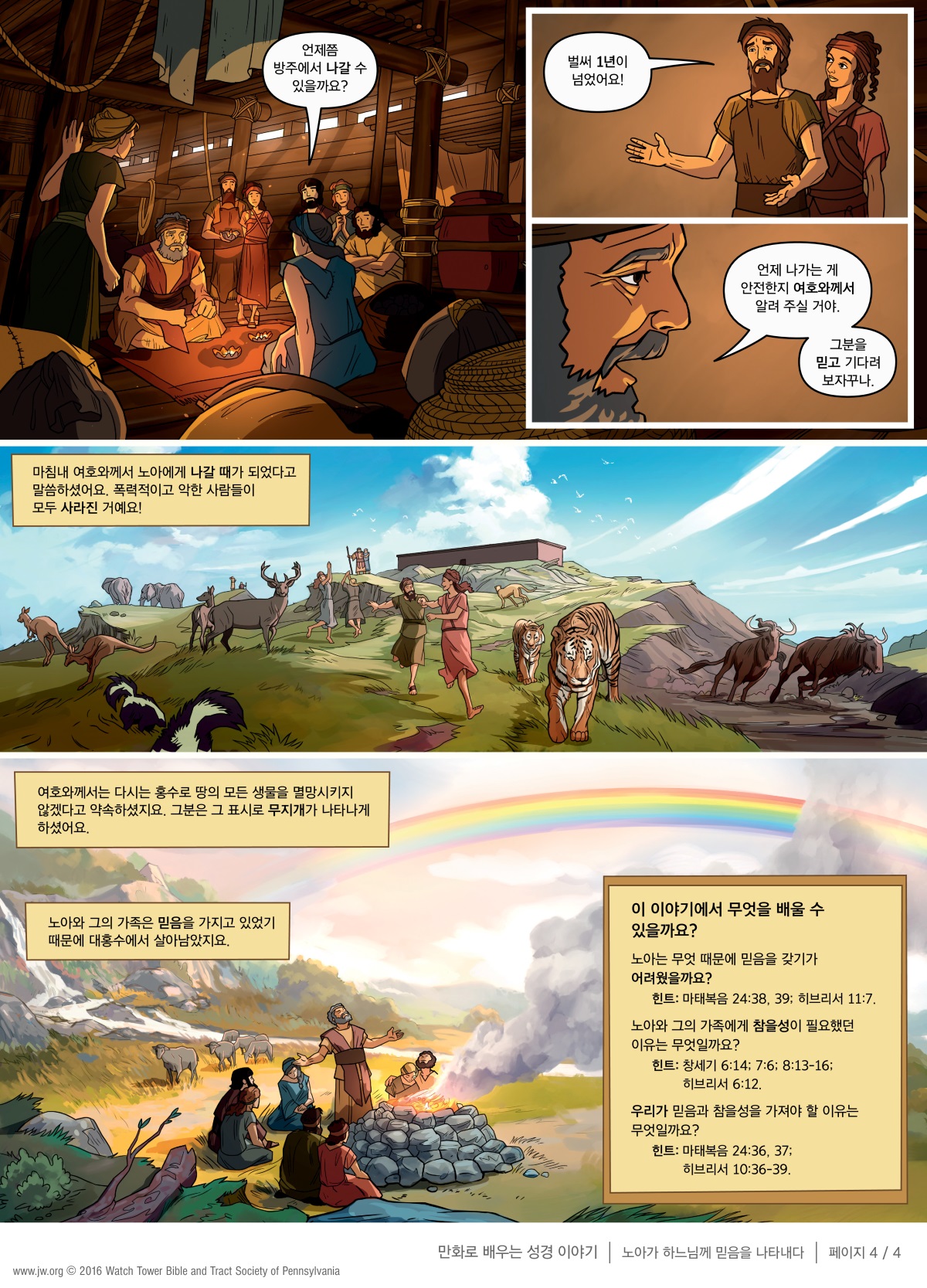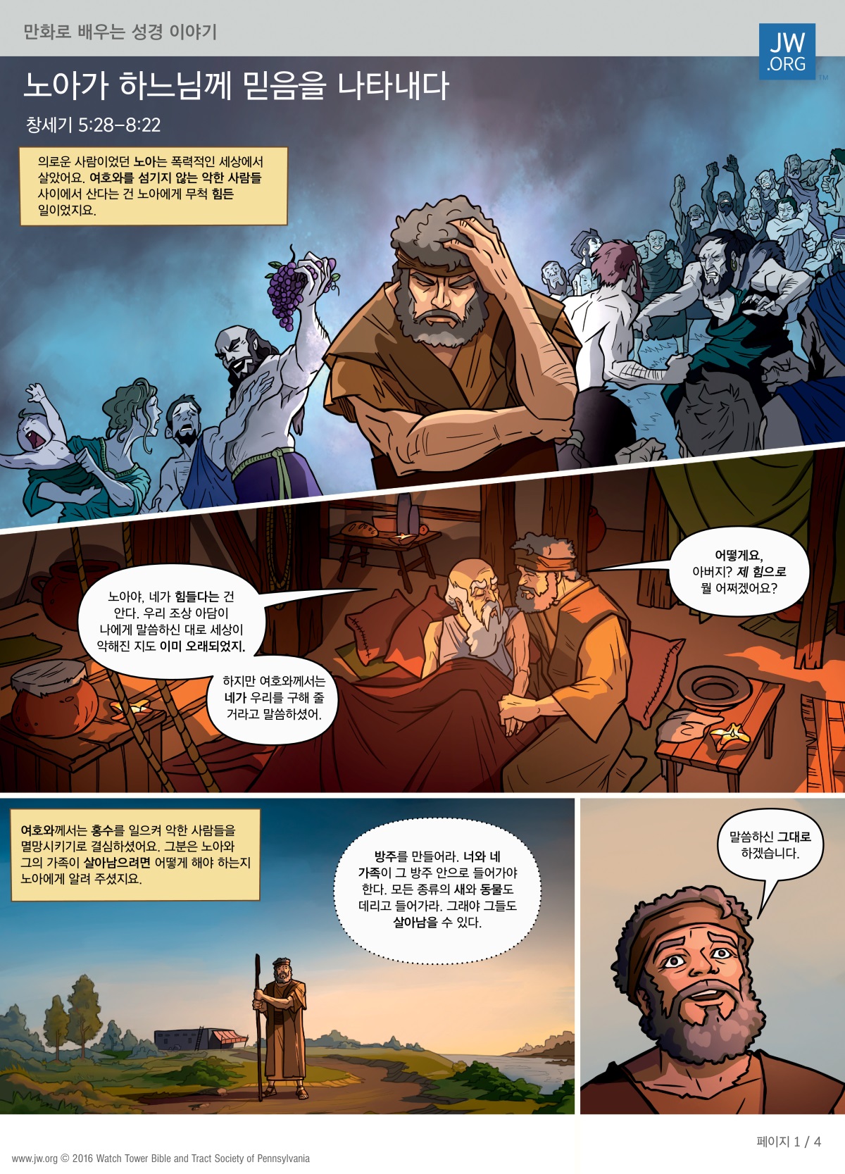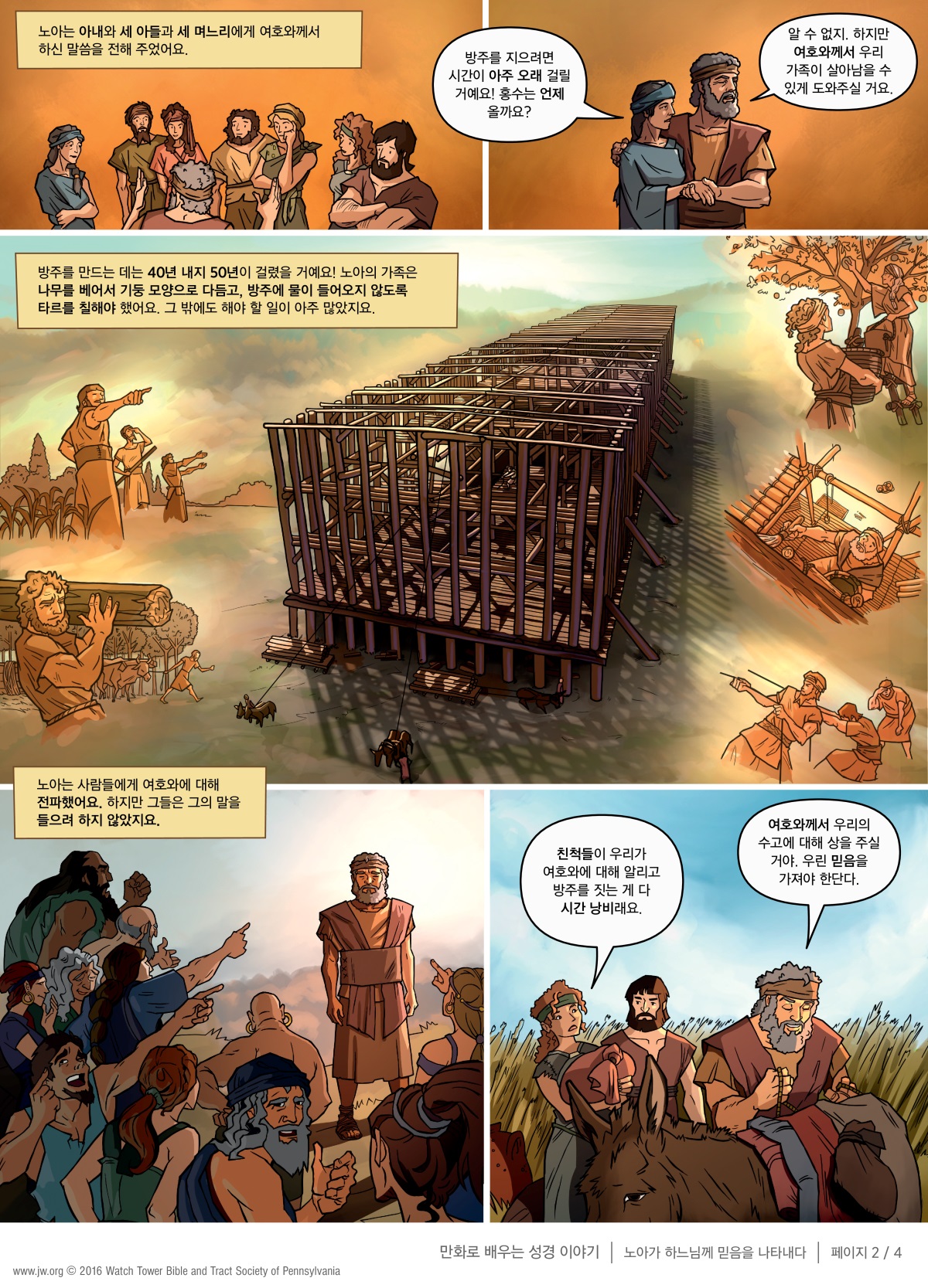만화로 배우는 성경 이야기 노아가 하느님께 믿음을 나타내다 노아는 가족과 동물들을 구하기 위해 거대한 방주를 만들었어요. 만화로 배우는 이 이야기를 다운로드해서 읽거나 인쇄해서 읽어 보세요. 다운로드